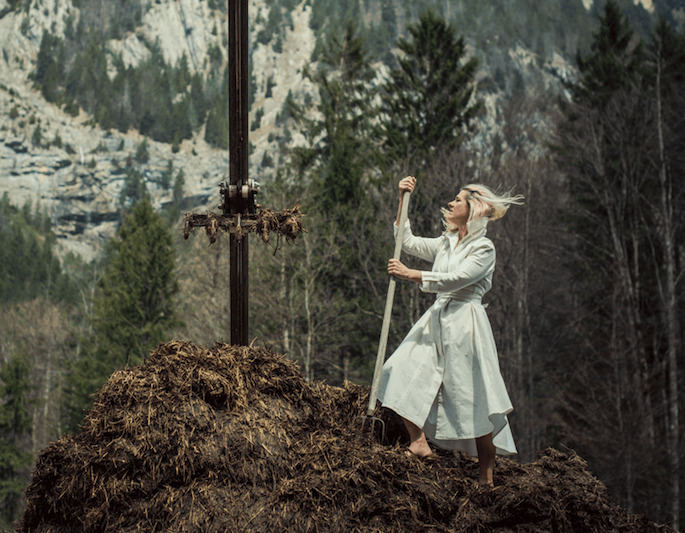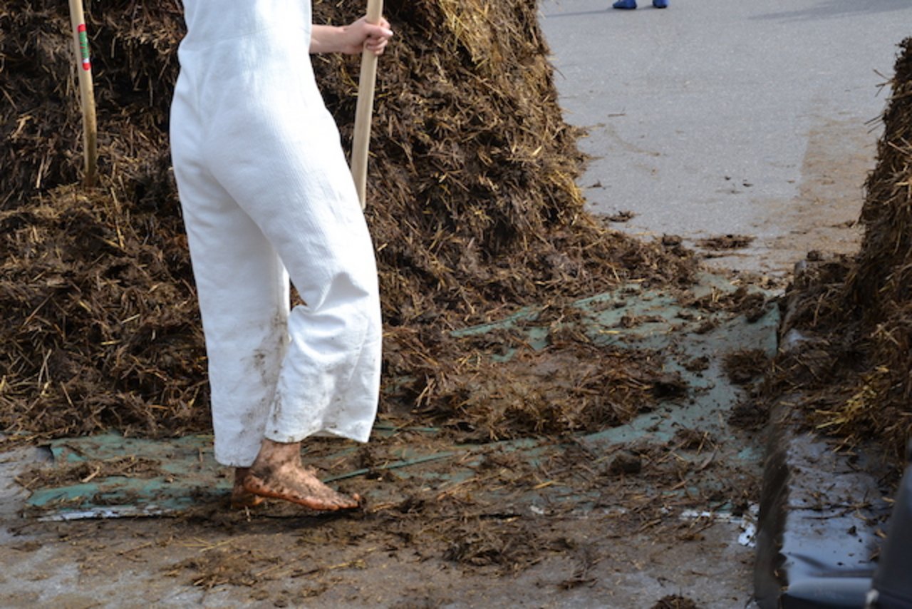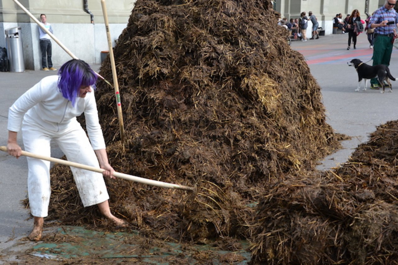 Zügig aber sorgfältig legt Kiener zwei bis drei Gabeln voll Mist bereit, stampft das Paket fest, lädt es auf die Gabel und erklimmt den wachsenden Mistwürfel. Dieser sieht gut aus, wenn auch nicht gezopft, so aber sorgsam gestapelt. Pausen gönnt sich die Künstlerin wenig. Zwischendurch bezieht sie Stellung auf dem etwa 2 Meter hohen, noch ungeordneten Misthaufen. Dort oben sieht sie aus wie eine Helvetia mit Mistgabel, violettem Haar und ernstem Gesicht.