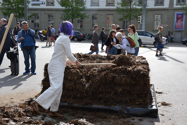 Die Szenerie ist ungewohnt: auf dem Bahnhofsplatz, mitten im abendlichen Pendlerverkehr, schichtet eine Frau in weissem Hosenkleid emsig Mist zu einem kunstvollen, quadratischen Haufen auf. Mit dem Mist wollte die Künstlerin Barbara Kiener ein Stück Land(wirtschaft) in die Stadt bringen.