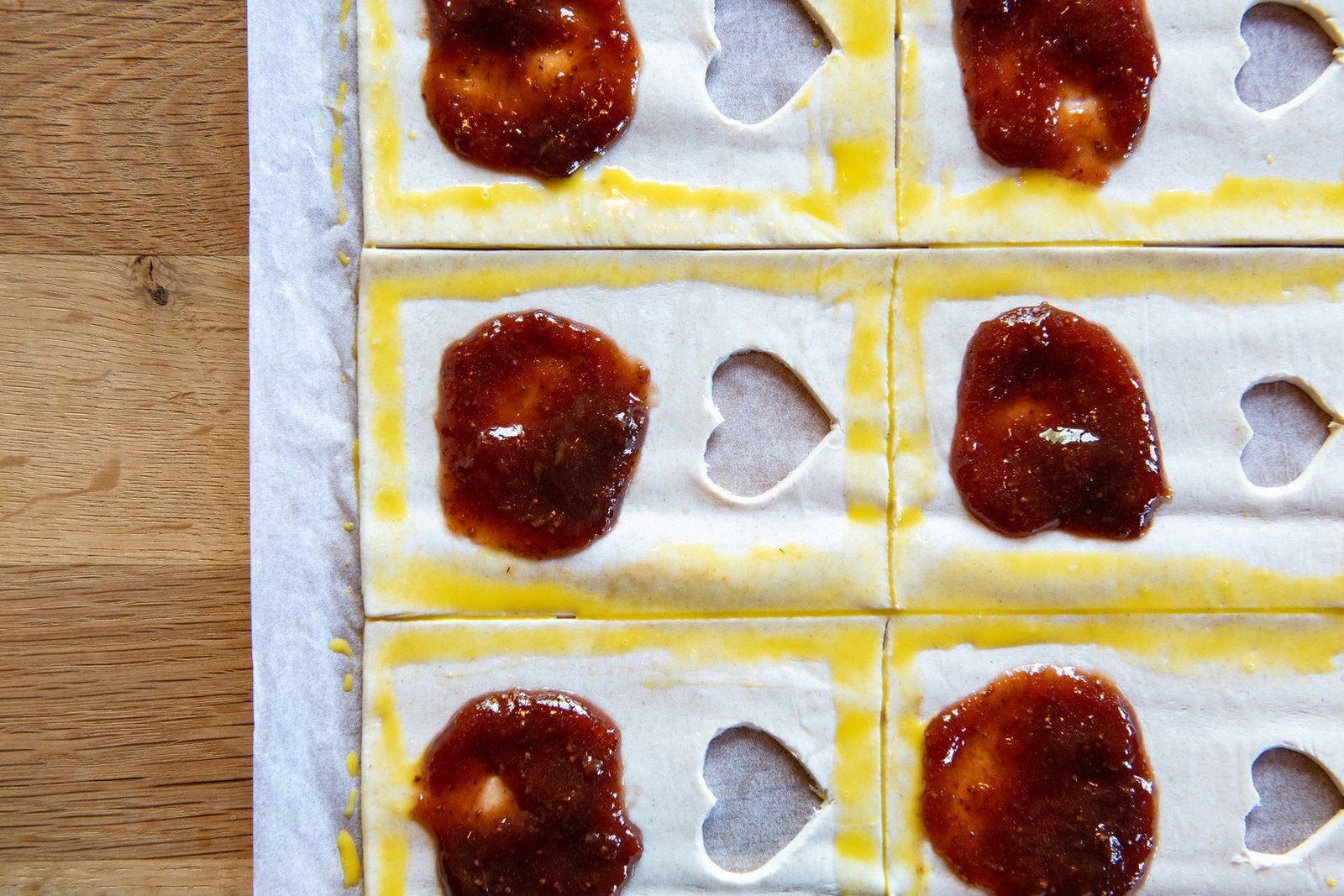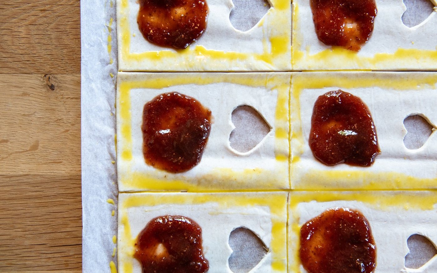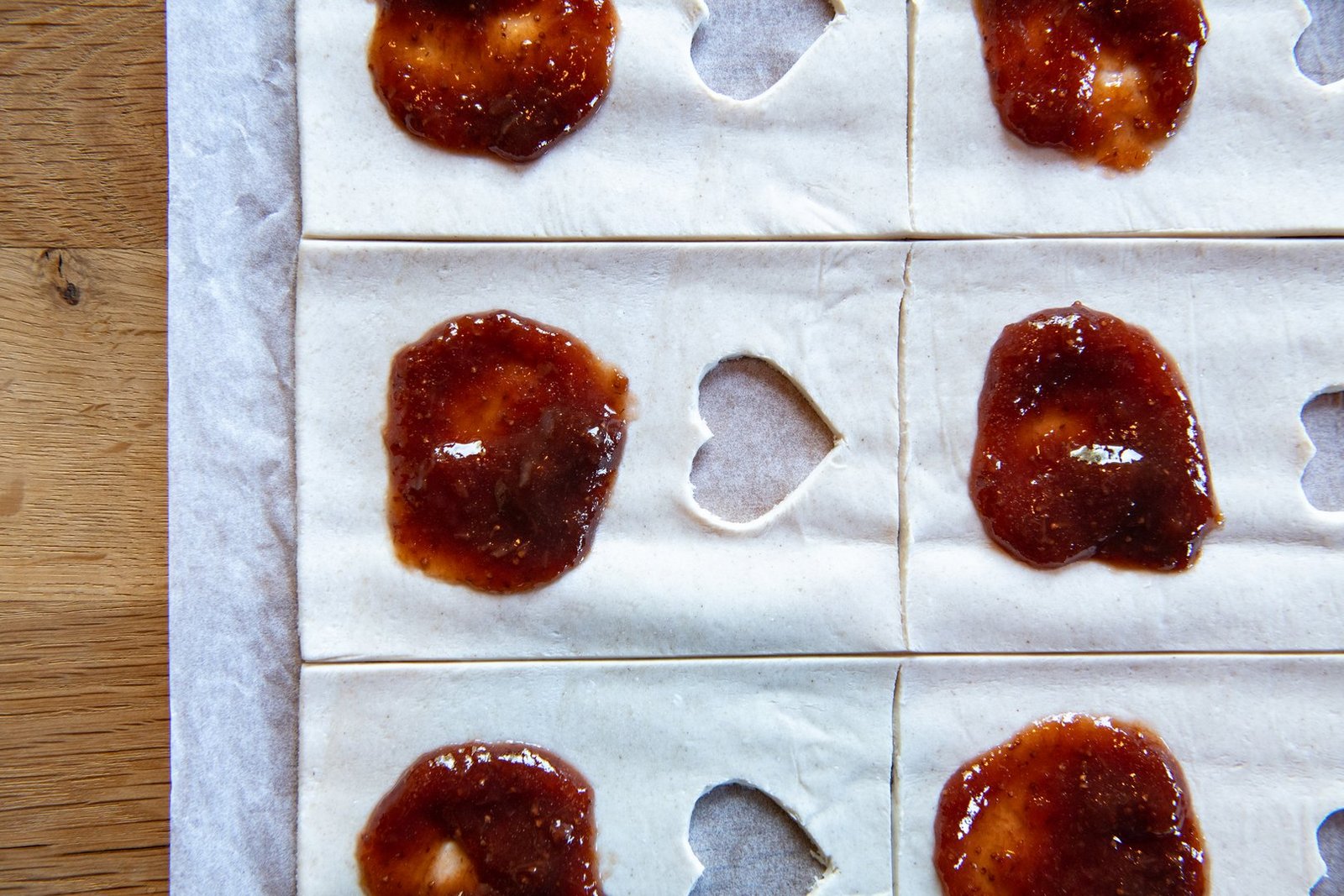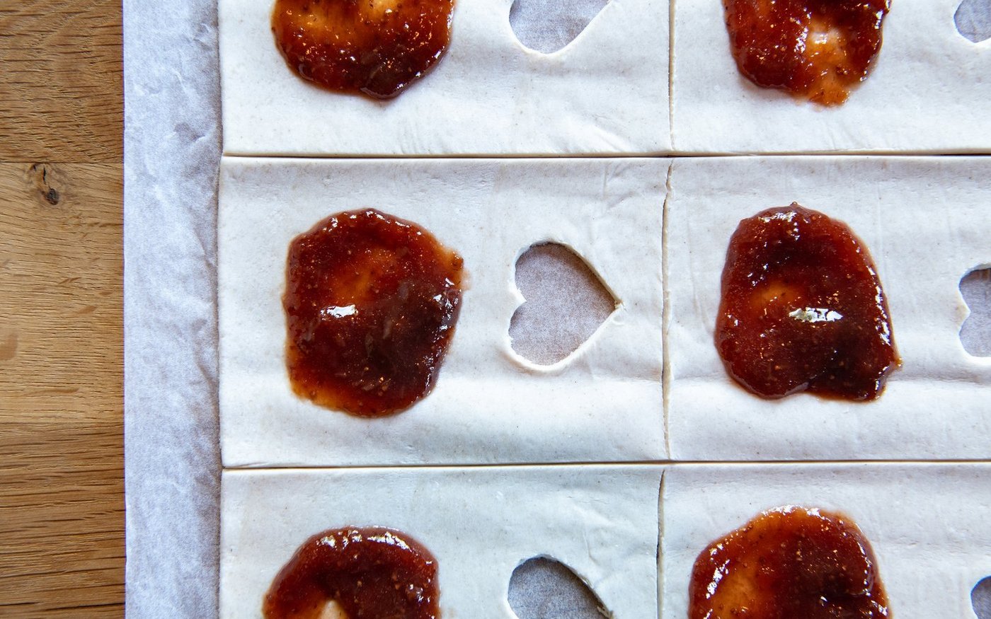 - Ungefähr ein Teelöffel Marmelade auf der zweiten Hälfte des Rechtecks verteilen. Nicht ganz bis an den Rand. Alternativ kann auch Schokoladenaufstrich oder, wer es herzhaft mag, rotes Pesto oder Pesto mit Käse verteilt werden.