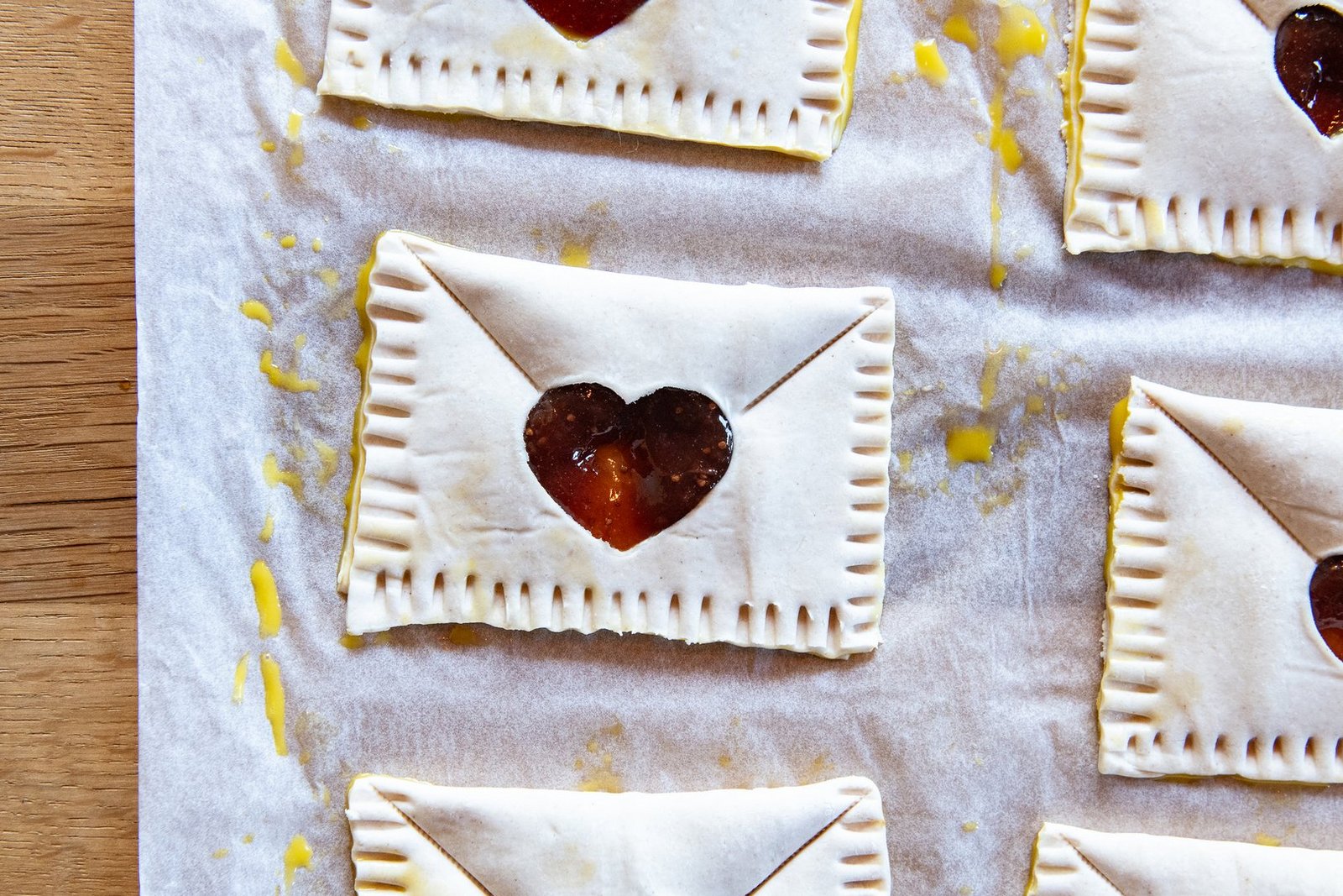 - Die Briefchen zuklappen und den Rand mit der Gabel zusammendrücken. Anschliessend mit dem Messer die Lasche eindrücken, aber nicht ganz durchschneiden. Tipp: Das Briefchen mit Eigelb bestreichen für einen schönen Glanz. Eine salzige Variante könnte mit etwas Käse bestreut werden.
