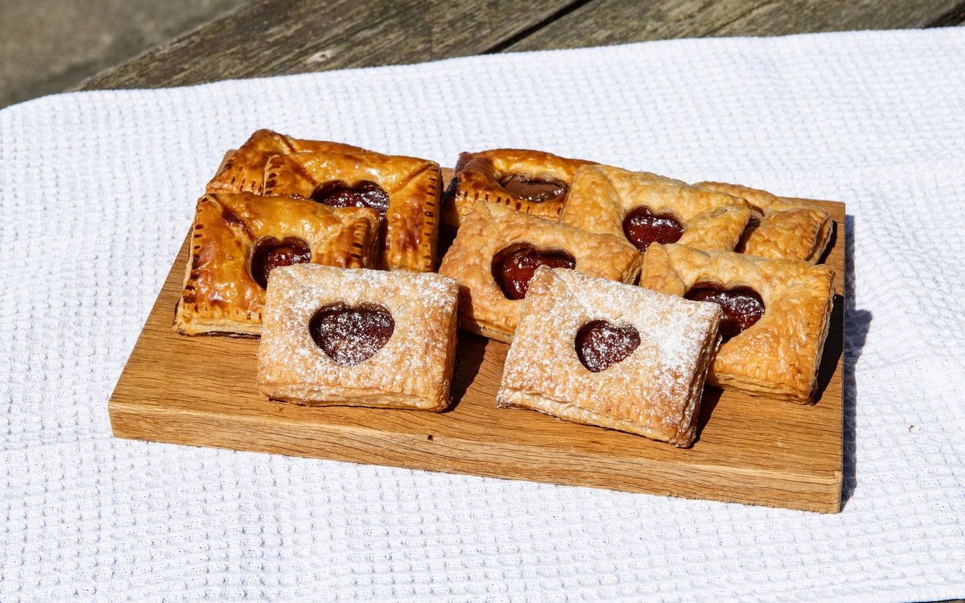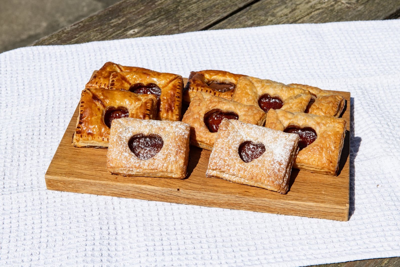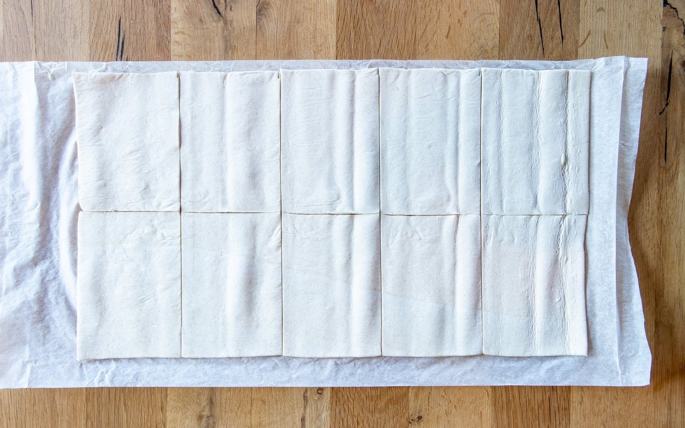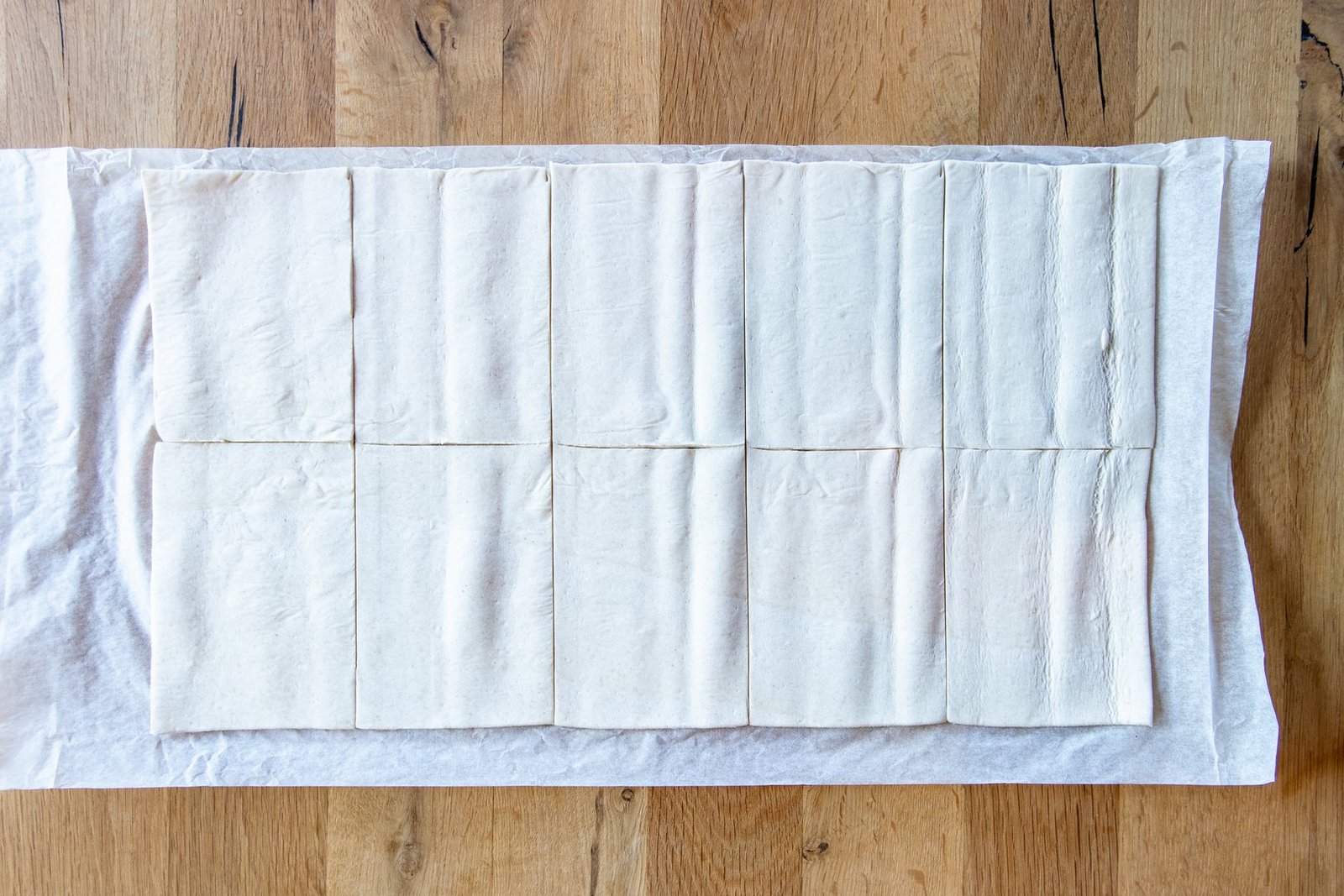 - Den Blätterteig in zehn gleich grosse Rechtecke schneiden.