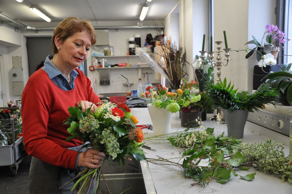 Eine schwarze Arbeitsschürze umgebunden, steht sie im Floristikatelier der Bundesgärtnerei. Das Marzilibähnchen sieht man vor dem Fenster auf und ab fahren. Aus dem Radio tönen Oldies, auf Rollwägelchen stehen Kübel mit Schnittblumen parat für die Verarbeitung.