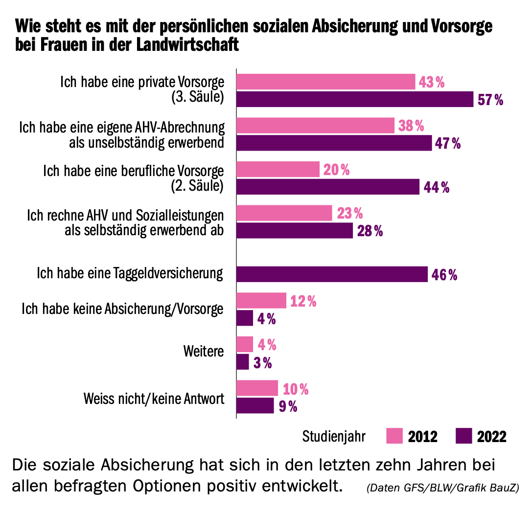 Die Studie «Frauen in der Landwirtschaft 2022» des Bundesamts für Landwirtschaft (BLW) untersucht nach 2002 und 2012 zum dritten Mal die Situation und Rolle der Frauen in der Landwirtschaft. Für die am Donnerstag veröffentlichte Untersuchung nahmen 778 Frauen aus allen Landesteilen an einer Online-Umfrage von GFS-Zürich teil. Dazu kamen vier Gruppendiskussionen mit 29 Frauen.