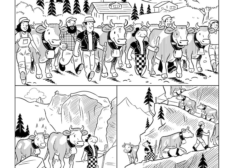Alpmeister Erich engagiert ihn auf der Stelle, und schon geht es los mit dem Fegen der Alpgebäude. Dann kommen bereits die Tiere und Globi marschiert im Mutz mit den Kühen zur Alp hinauf. Damit es einfacher geht, lässt er sich mit BS (Braunviehstärke) den steilen Hang hinaufziehen.