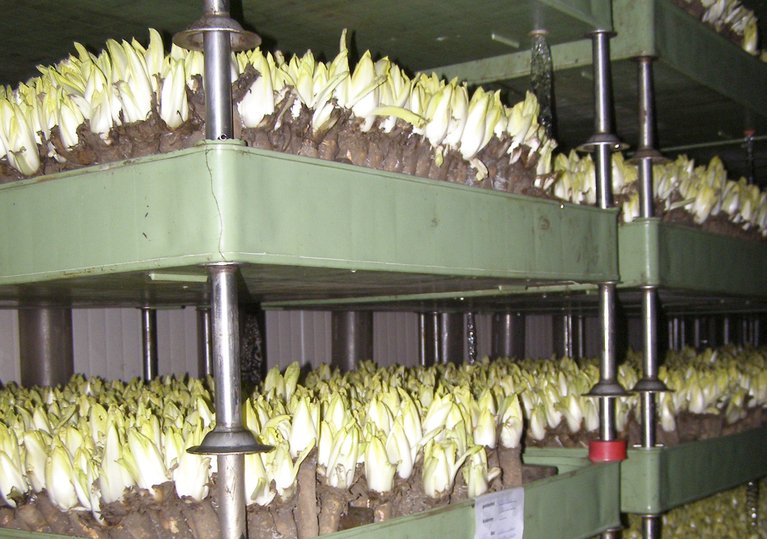 Denn zunächst müssen auf dem Feld die Samen ausgebracht werden. Er wächst danach nur langsam, die Wurzel dringt dabei weit in den Boden ein. Schliesslich wird die Wurzel gerodet und danach in Kühlräumen gelagert. Dann werden die Wurzeln in den lichtdichten Räumen aufgestellt, wo sie austreiben und der Chicorée geerntet werden kann.
