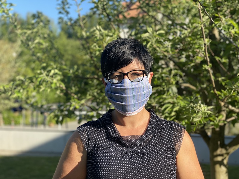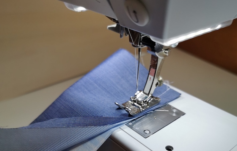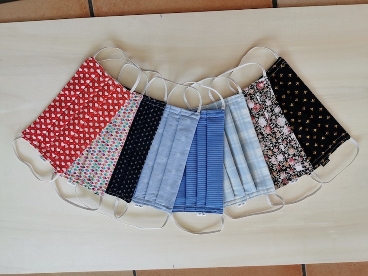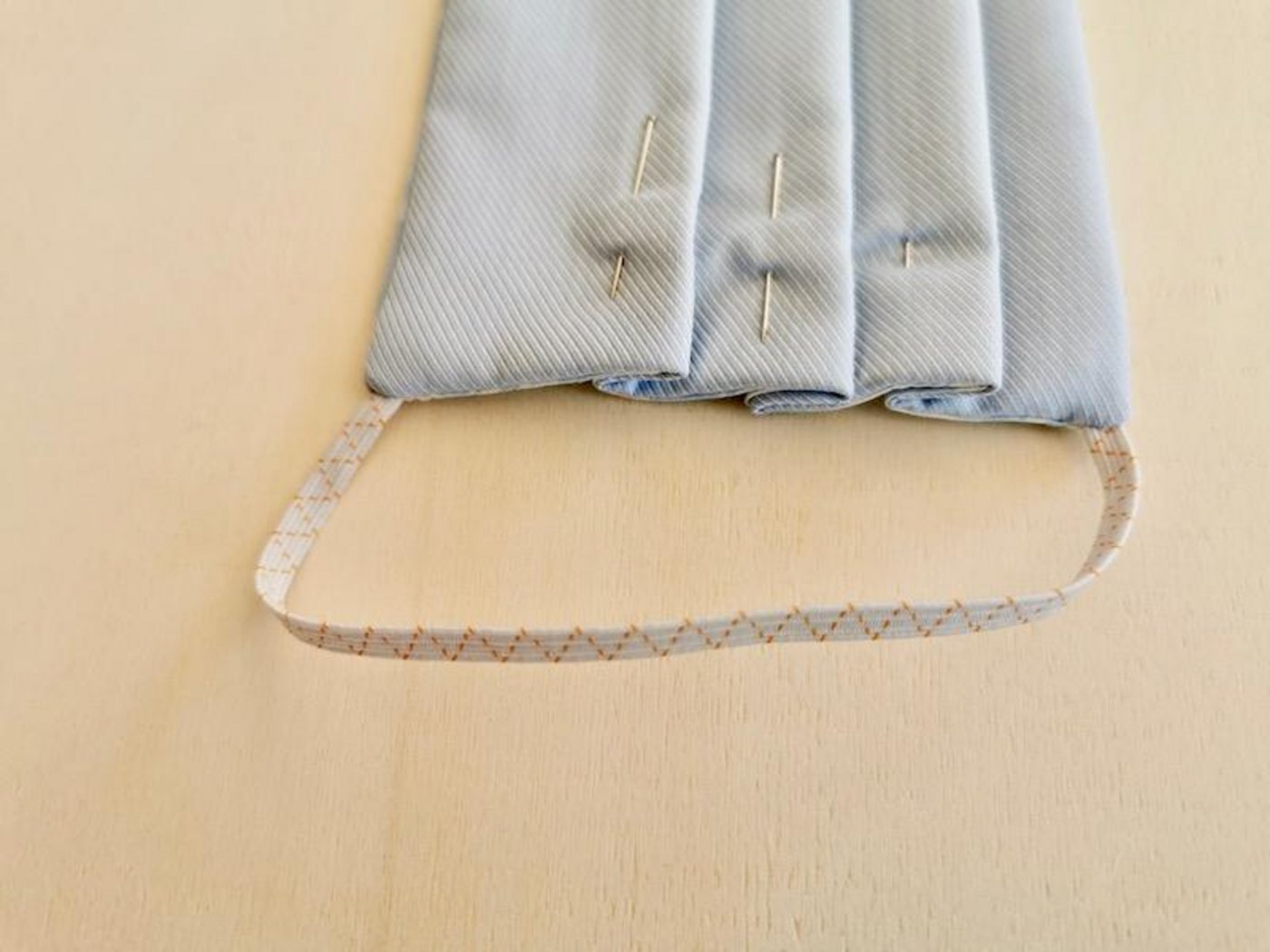 6. Drei gleichmässig verteilte Falten bilden, um eine Maskenhöhe von etwa 10cm zu erhalten. Mit Nadeln abstecken. Beide Seiten je 1cm vom Rand und dann 5mm von Rand entfernt zusammennähen. Die Nadeln entfernen und nochmals bügeln.