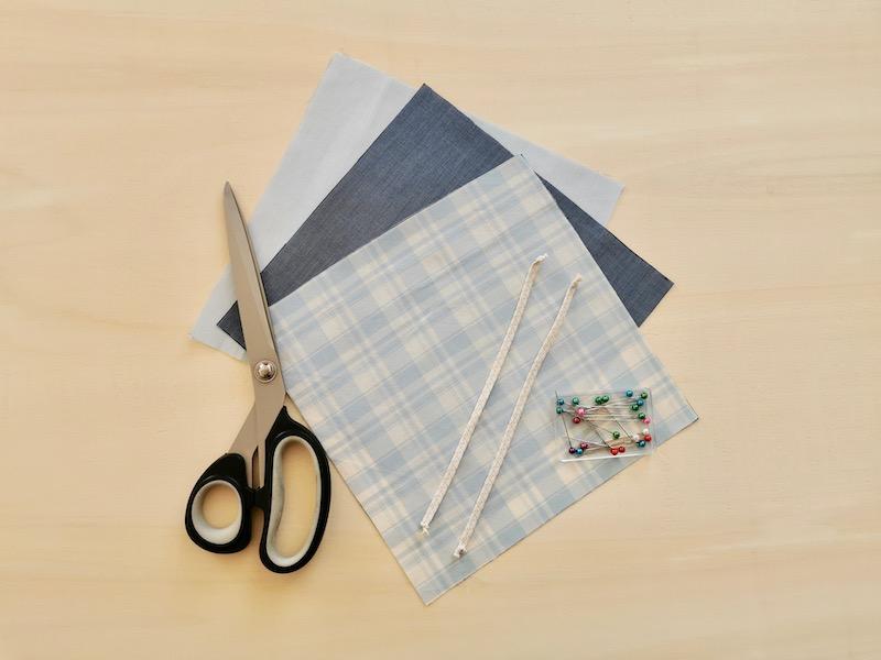 2. Die drei Stoffquadrate übereinanderlegen. Darauf achten, dass die beiden Stoffe, die bei der fertigen Maske sichtbar sein werden, aufeinanderliegen. Die Stofflagen an zwei gegenüberliegende Seiten, 1cm vom Rand entfernt, zusammennähen.