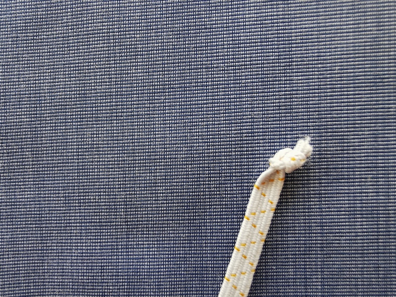 3. Auf der Innenseiten der beiden Nähte je ein Gummiband einführen und auf beiden Seiten mit einer Nadel festmachen. Der Knoten ist aussen.