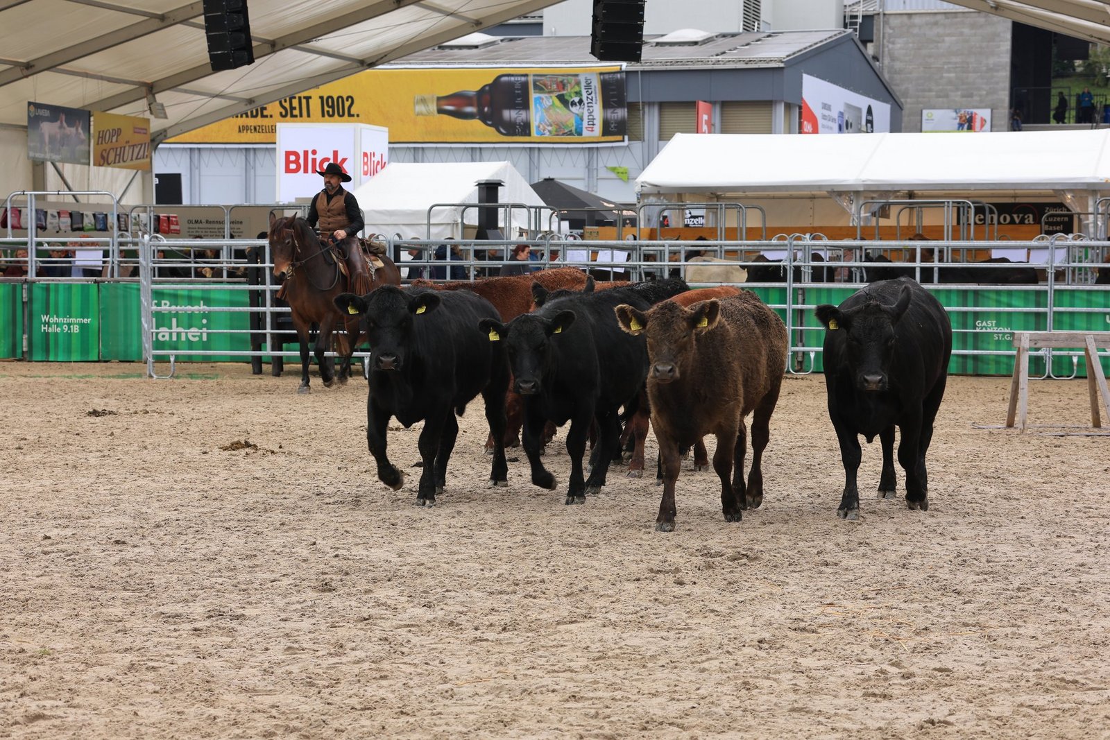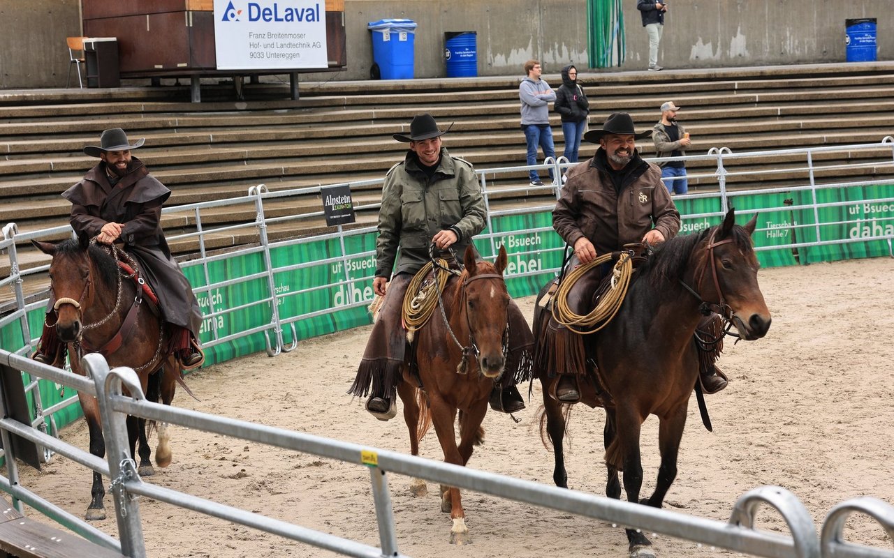 Ebenfalls in der Arena präsent waren die «Cowboys» von der Stone Ranch aus Wegenstetten. Es waren Stefan, Silvan und Thomas Schreiber. Sie waren hoch zu Ross und demonstrierten eindrücklich während des ganzen Anlasses, wie sie die Kühe nach der Methode der «low stress stockmanship» in der Arena trieben.