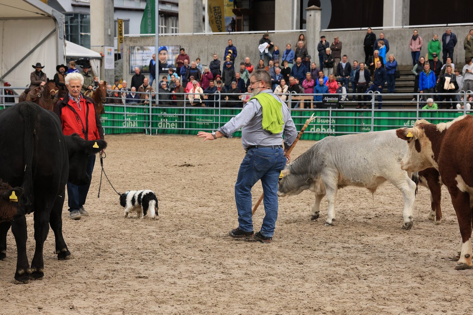 Die Mutterkühe reagierten sofort auf die Präsenz des Hundes. Während einige ihn misstrauisch beschnupperten, standen andere, wie zum Beispiel die Hereford-Kuh «Anik» regelrecht «unter Strom». Andrea Accola musste sie ein paar Mal mit seiner Präsenz bremsen. «Filou» war sichtlich wohl, als er wieder aus der Arena durfte.