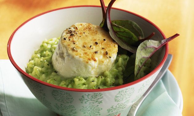 - Risotto auf Teller verteilen, Käse darauf anrichten, garnieren.
