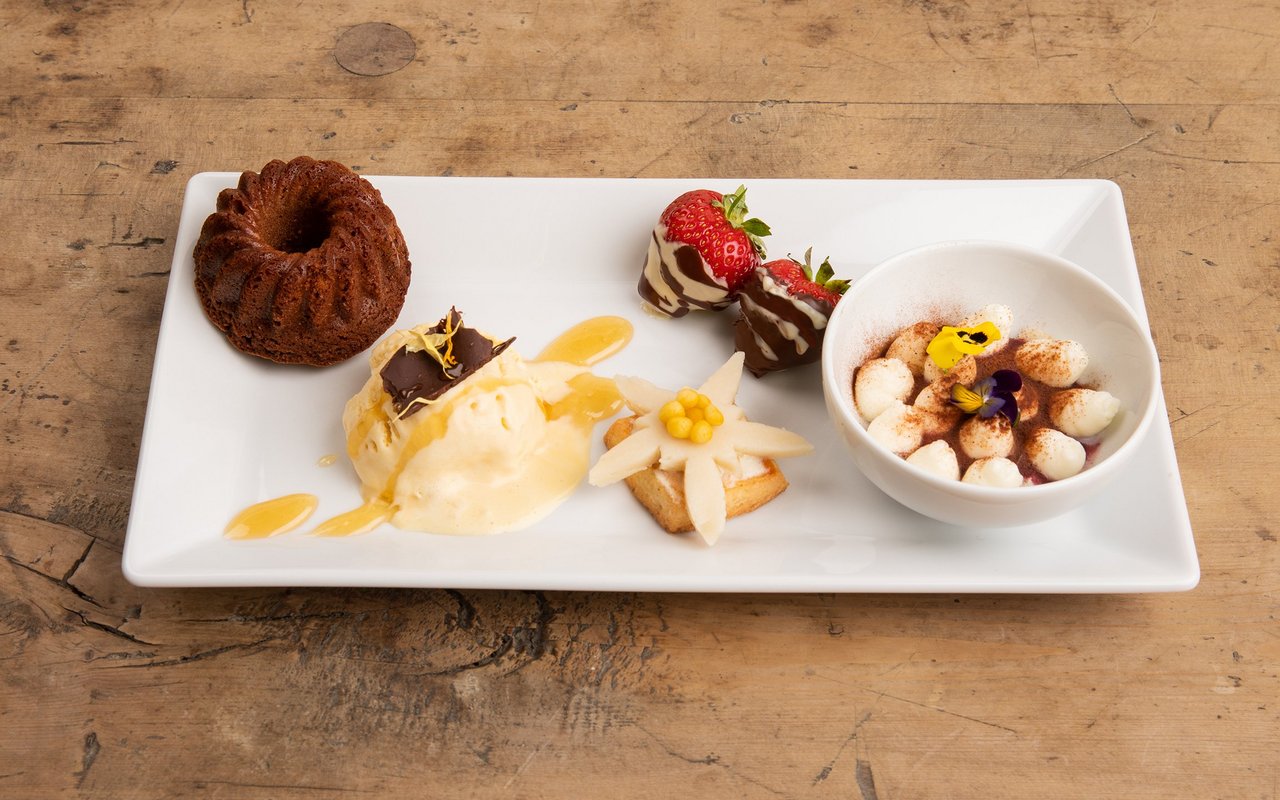 Schale mit der Schwarzdorncrème auf Dessertteller stellen. Eine Kugel Löwenzahnhonig-Glace dazu anrichten. Ein Schokolade-Kirsch-Muffin und ein Edelweissguetzli dazulegen. Mit Erdbeeren, Schokoladeblättchen und Honigschlenker ausgarnieren.