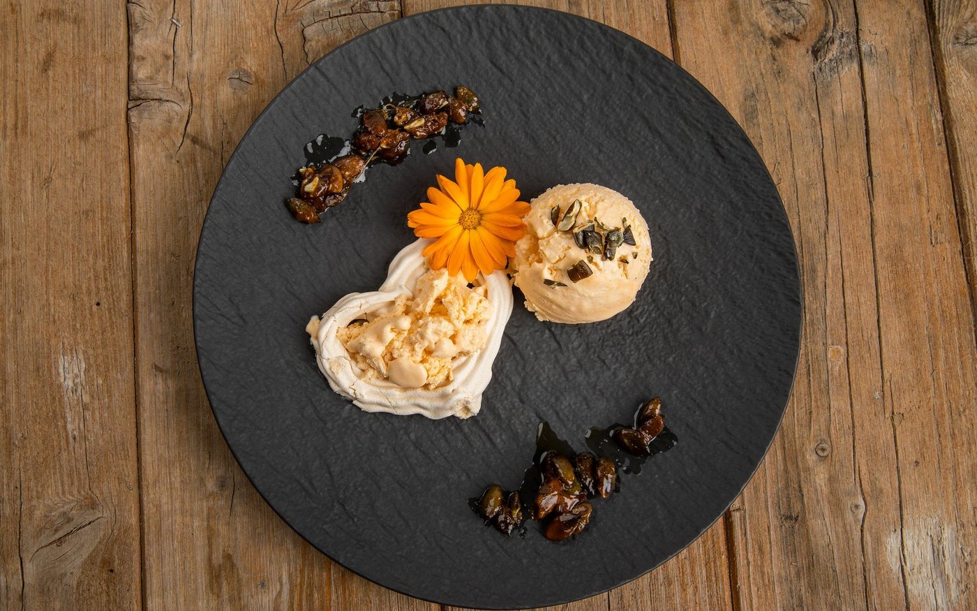Vom Kürbisglace Kugeln abstechen, auf Dessertteller platzieren und mit Kürbiskernen bestreuen. Einen Tupfer Rahm daneben platzieren und mit Meringues belegen. Mit Tannenhonig verzieren.
