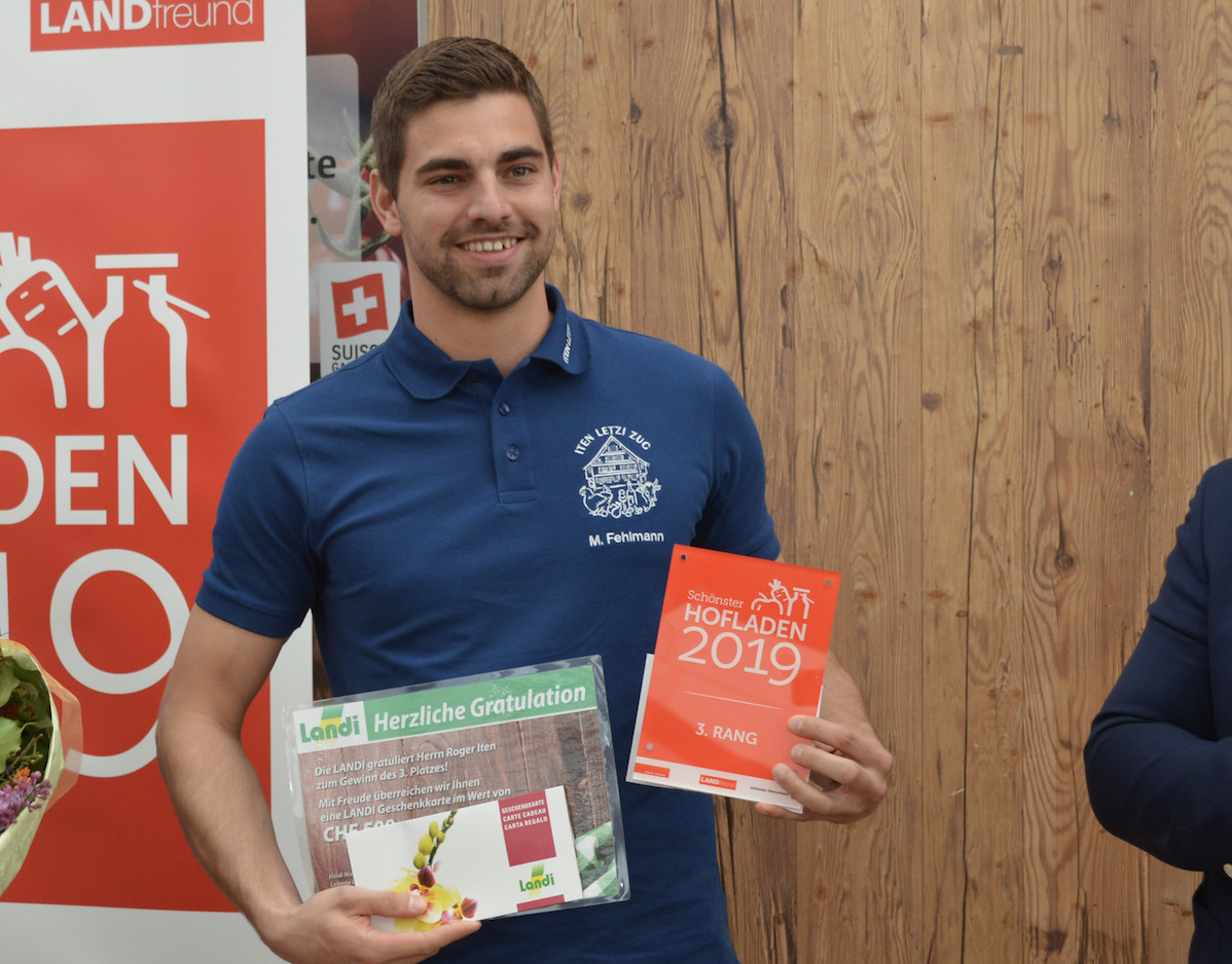 Auf den dritten Platz schaffte es Roger Iten mit seinem Hofladen in Zug. Der Jury habe es gefallen, dass der Laden sehr durchdacht sei. Der Hof vertreibt seine Produkte zu hundert Prozent über den Weg der Direktvermarktung. Dies ist angesichts der Grösse erstaunlich. So gibt es auf dem Hof rund 90 Milchkühe, die etwa 800'000 Liter Milch pro Jahr geben. Ein Teil vermarktet der Betrieb über den Hofladen, der Rest geht per Lieferdienst an Abnehmer aus der Region. Im Regal des Hofladens sind neben Milchprodukten auch Eier, Obst und Getreideprodukte zu finden.