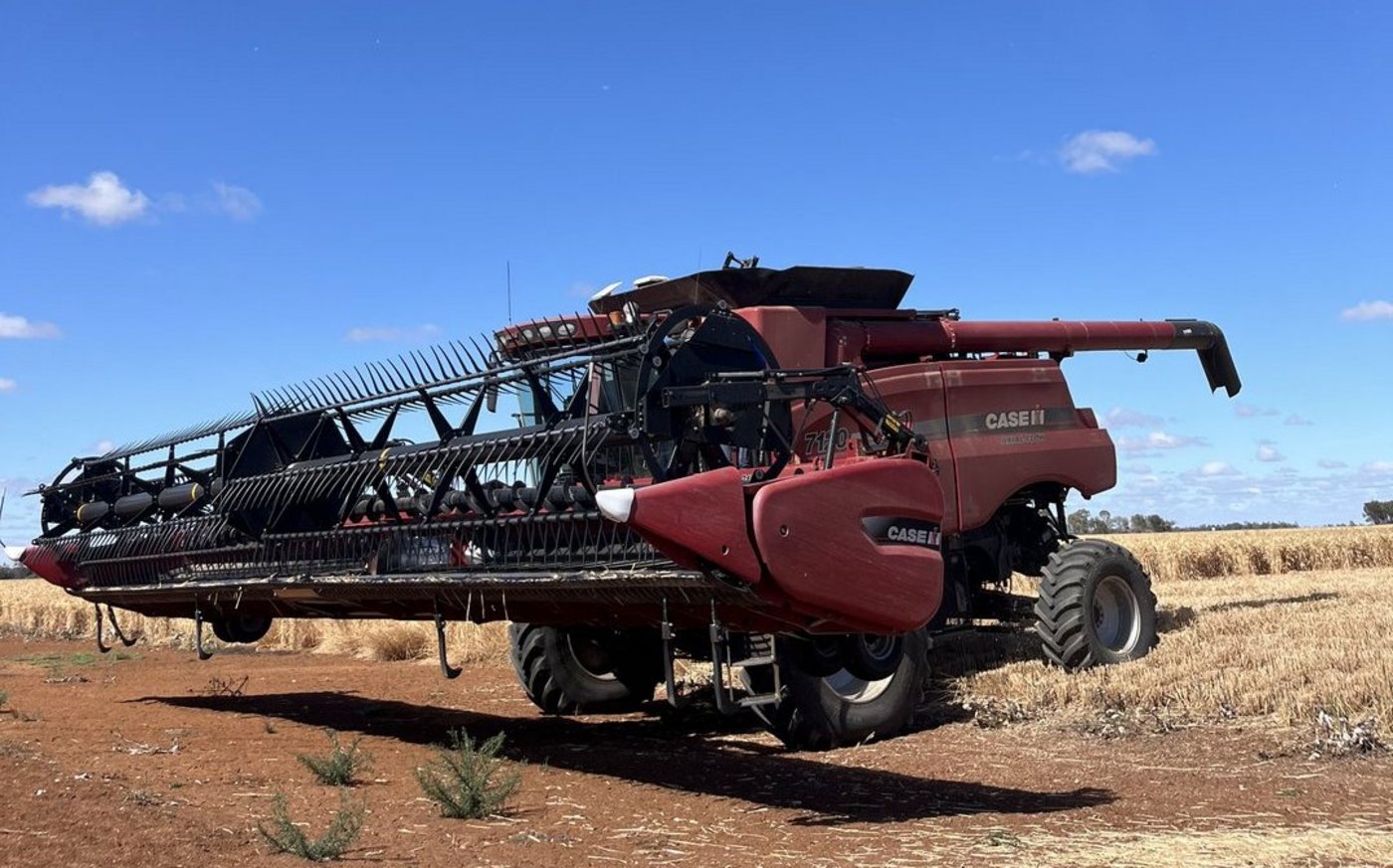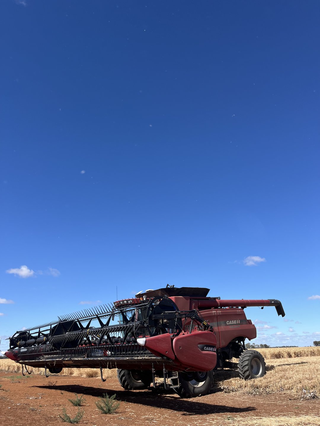 Wir haben Glück, der Fahrer fragt, wer mitfahren möchte. Natürlich schnellen alle Hände (der Männer) in die Höhe. Es handelt sich um den Case 7120 Axial-Flow IH mit einer Mähbalkenbreite von 15 Metern. In Australien gibt es keine Trocknungsanlagen für Getreide, das heisst, der TS-Gehalt muss bei der Abgabe tiefer sein als bei uns.