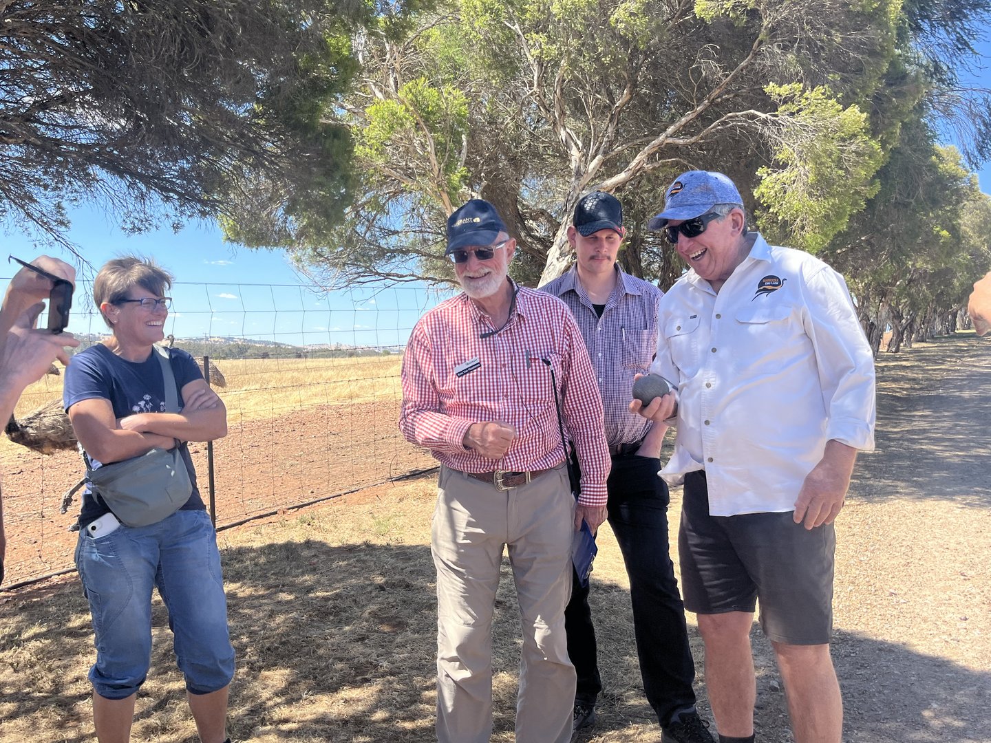 Der Besitzer Ian Marston hält ein Emu-Ei in der Hand. Der Mann im rotkarierten Hemd ist der lokale Tourguide Kees van Haasteren. Aus dem straussenähnlichen Tier gewinnen sie Öl, Federn, Fleisch und Fett für Kosmetikprodukte. Man sagt, Emu-Komponenten machen «für immer jung». Darum ist es ein lukrativer Betriebszweig, sofern Indien das Produkt nicht fälscht und billiger an den Markt bringt.