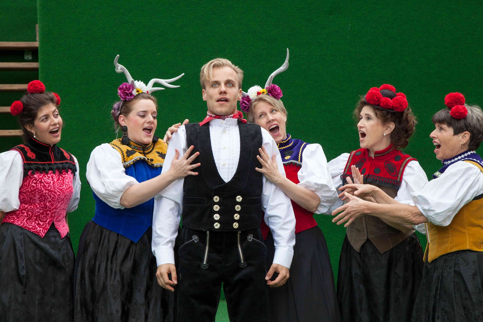 Die Freilichtspiele Moosegg sind weit übers Emmental hinaus bekannt. Die kleine Waldbühne auf rund 1000 Meter über Meer besticht mit dem Charme ihres Standorts. Grillengezirpe, Vogelgezwischer und Kuhglockenbimmeln untermalten am Mittwochabend die diesjährige Première der Comedy-Operette "Schwarwaldmädel" nach L. Jessel. Zudem ist der weite Blick ins Emmental von der Theaterbar aus, wahrscheinlich nicht nur für eine Flachlandindianerin, wie die Schreibende eine ist, schlicht grandios. Kurz vor Beginn der Vorstellung tönt weit weg Donnergrollen. Die Hoffnungen, dass das Gewitter nicht näher kommen möge, sind deutlich spürbar. Doch das Wetter ist dem "Schwarzwaldmädel" hold; Regen setzt erst bei der Fahrt von der Moosegg hinunter ein.
