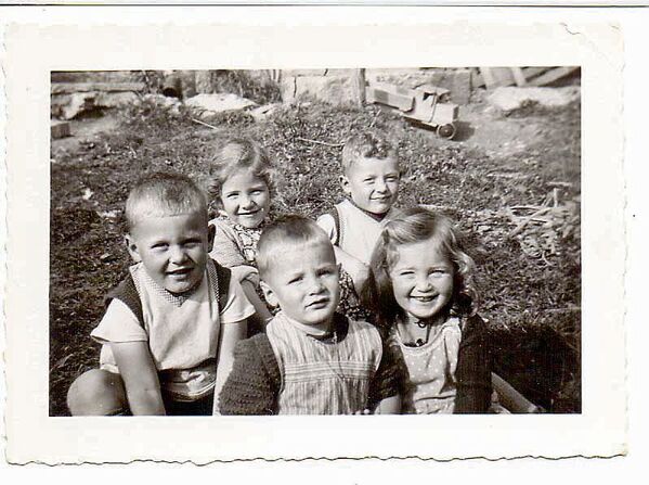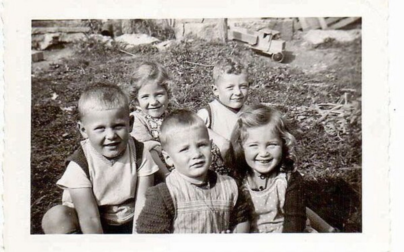 Fünf Kinder im Jahr 1952. Vier von ihnen schauen zuversichtlich in die Kamera; der Zweitjüngste vorne in der Mitte eher kritisch. Wollte er sich nicht fotografieren lassen? Wir wurden damals nicht oft fotografiert. Wer konnte sich schon eine Kamera leisten? Wenn wir von den Eltern für ein Bild «gebüschelt» wurden, hatten wir meistens keine Freude. Da mussten wir uns hinsetzen, lächeln, uns ruhig verhalten und warten. Rollfilme aus Zelluloid waren teuer. Deshalb musste man sich Zeit nehmen für die Vorbereitung, damit alle Bilder brauchbar waren; keines durfte verloren gehen.