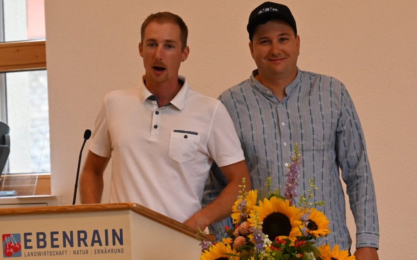 Meist laufen die Abschlussfeiern an den Berufsbildungsstätten jedes Jahr nach dem bewährten Muster ab. Heuer hingegen gibt es am Ebenrain eine Neuheit. Die Ehemaligen Ebenrain verleihen zum ersten Mal zwei Wanderpreise. Michael Sutter, Präsident Verein Ehemalige Ebenrain vergibt die eine goldene Kirsche für den besten Fachvortrag. Diese holt sich Matthias Zwygart aus Tenniken. Die zweite goldene Kirsche geht an den besten Vortrag im Bereich allgemeinbildender Unterricht (ABU). Diesen Preis holen sich Timon Ballmer, Oberdorf, und Roman Mundwiler, Zunzgen, für ihre Teamarbeit. [IMG 5]