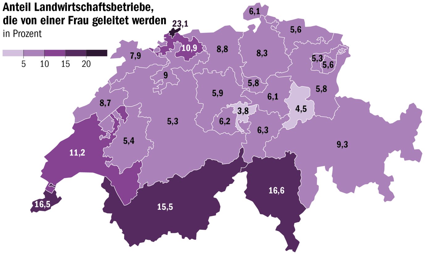 2005 lag der Anteil Betriebsleiterinnen noch bei 4,3 % und stieg stetig an. Das Jahr 2024 zählte gesamtschweizerisch 7,7 % beziehungsweise 3615 selbstständige Betriebsleiterinnen. Die Anzahl der Betriebe, die von einer Frau geführt werden, fällt regional unterschiedlich aus. Im Westen und im Süden der Schweiz war der Anteil an Betriebsleiterinnen leicht höher als etwa in der Innerschweiz. Der Kanton Nidwalden wies mit 3,8 % den niedrigsten Anteil auf. Prozentual den höchsten Anteil einer weiblichen Betriebsleitung wies mit 23 % Basel-Stadt auf. Es darf dabei aber nicht vergessen werden, dass es dort auch nur eine kleine Anzahl Landwirtschaftsbetriebe gibt. Auf Basel-Stadt folgten die Kantone Tessin, Genf und Wallis mit den meisten Betriebsleiterinnen (siehe Grafik).