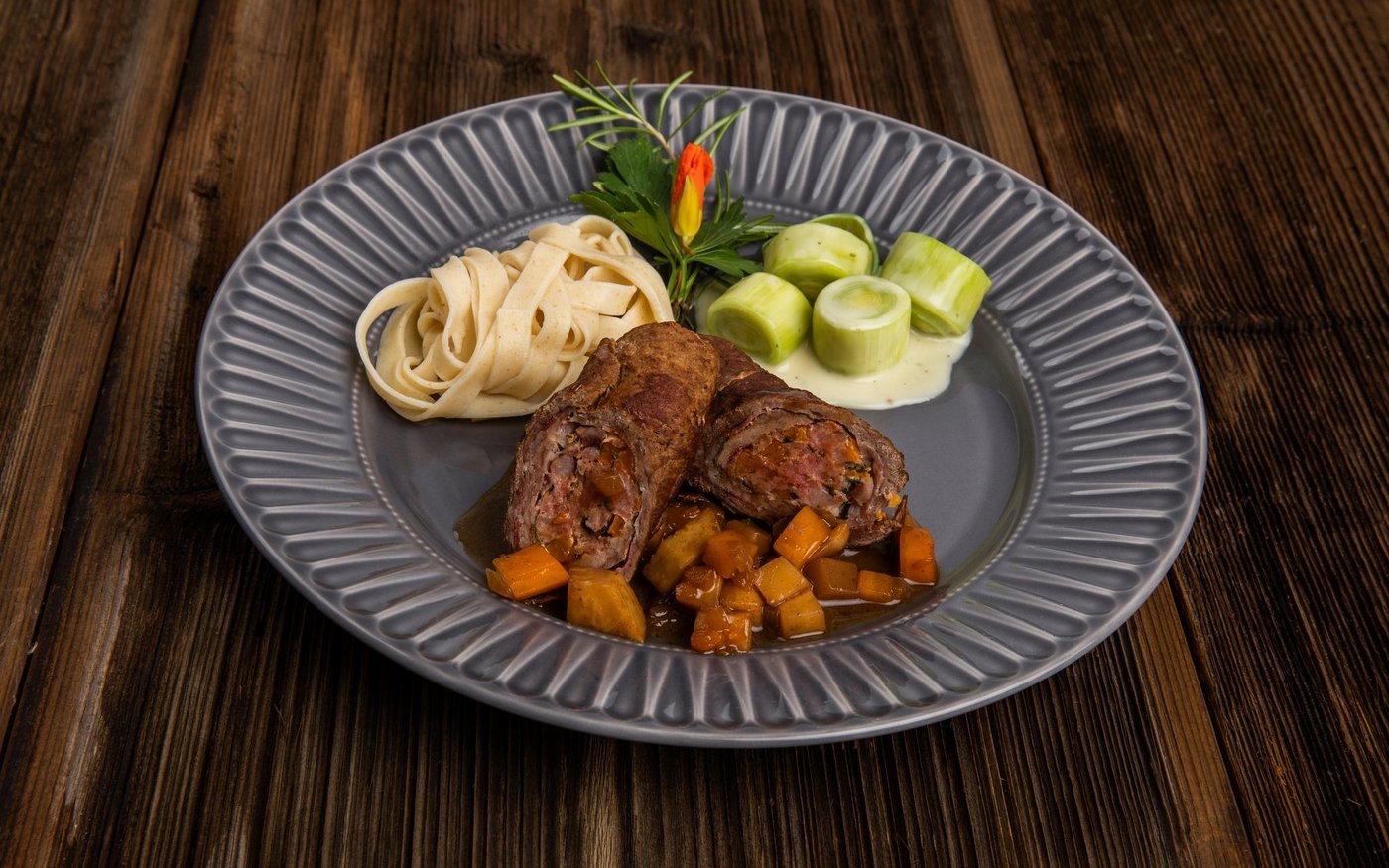 - Wirz-Röllchen auf vorgewärmte Teller anrichten. Dazu Dinkelteigwaren und Lauchgemüse anrichten.