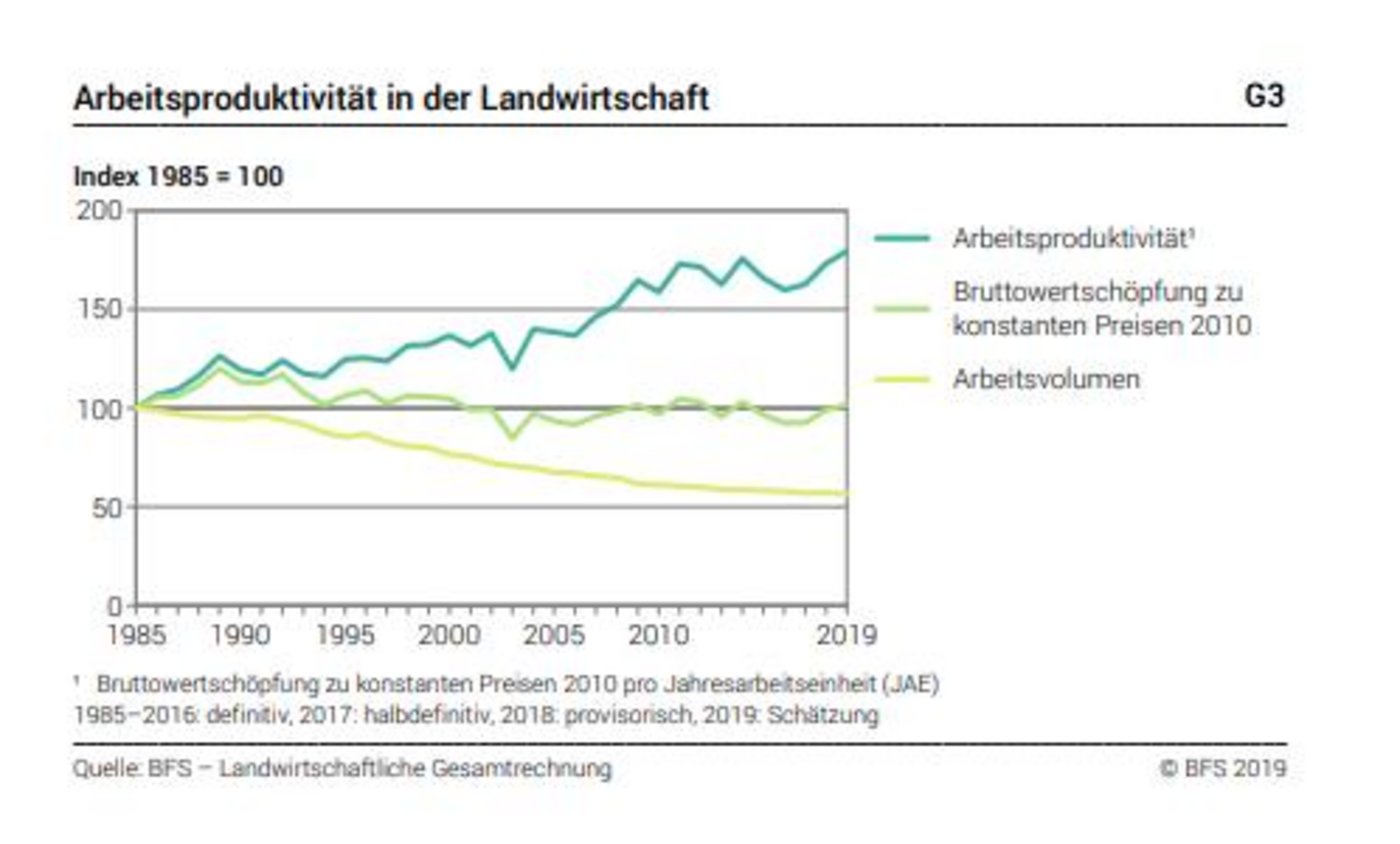 Nach den ersten Schätzungen nimmt das Arbeitsvolumen 2019 gegenüber 2018 um 1,0 Prozent ab. Die Arbeitsproduktivität, die sich aus dem Verhältnis zwischen der Bruttowertschöpfung (zu konstanten Preisen von 2010) und dem gesamten Arbeitsvolumen der Landwirtschaft ergibt, steige damit im Vergleich zum Vorjahr um 3,7 Prozent. Seit 2000 ist das Arbeitsvolumen in der Schweizer Landwirtschaft stark gesunken (-26 Prozent), während die Arbeitsproduktivität um mehr als 31 Prozent zugenommen hat.