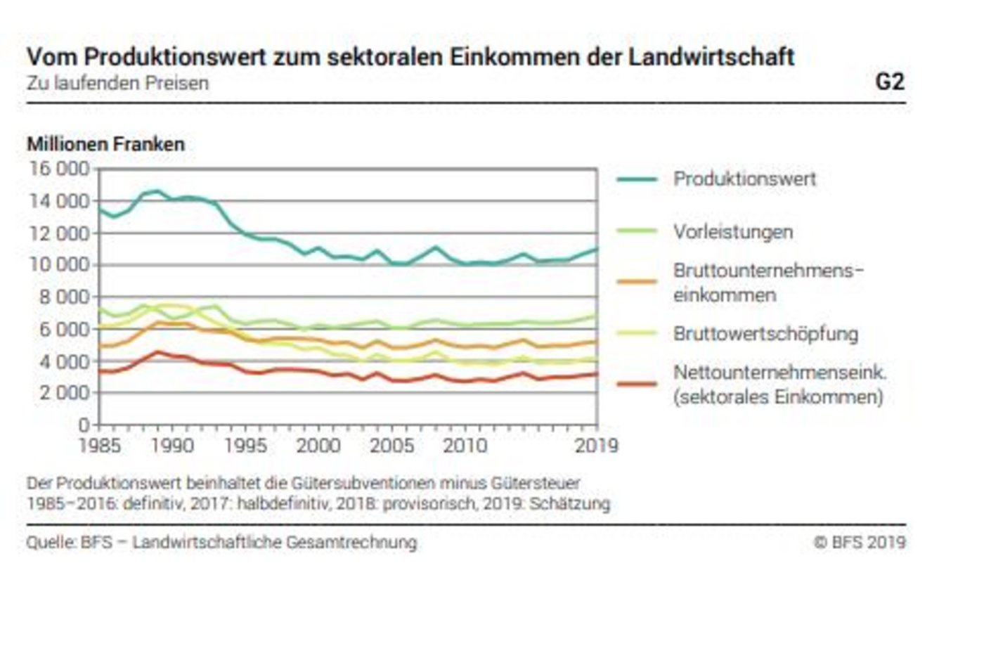 2019 nehmen die Einnahmen (Produktionswert, Staatsbeiträge und Habzinsen) um 2,4 Prozent oder rund 325 Millionen Franken auf 13,9 Milliarden Franken zu. Die Ausgaben (Vorleistungen, Abschreibungen, Löhne, Pachten, Schuldzinsen und Produktionsabgaben) steigen um 2,2 Prozent auf 10,8 Milliarden Franken an (+235 Mio. Franken). Das BFS schätzt das Nettounternehmenseinkommen der Schweizer Landwirtschaft (sektorales Einkommen)auf knapp 3,2 Milliarden Franken. Dies entspreche einem Plus von 2,9 Prozent (90 Mio. Franken) gegenüber 2018. Das sektorale Einkommen, das hauptsächlich die Arbeit und das produktive Vermögen (Kapital und Boden) sämtlicher Bauernfamilien in der Schweiz entschädigt, liegt damit mit nahezu 9 Prozent über dem Durchschnitt der letzten zehn Jahre (rund 2,9 Mrd. Franken).