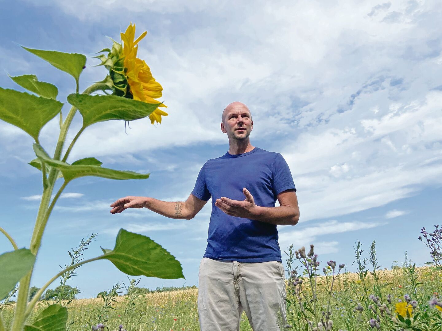 [REL 1]Folgende Kulturen wachsen auf dem Schmiedhof: 60 ha Wintergetreide 8 ha Raps 7 ha Karotten 30 ha Körnermais 12 ha Mais-/Bohnengemisch 7 ha Luzerne 17 ha Sonnenblumen 15 ha Kartoffeln 16 ha Tabak 20 ha Dauergrünland 2 ha Blühstreifen Betrieb mit Naturschutz-Fokus Die hohe Zahl an Kulturen hilft ihm, den Klimaschwankungen zu begegnen. In seinem Gebiet fallen jährlich nur 450 mm Regen.…