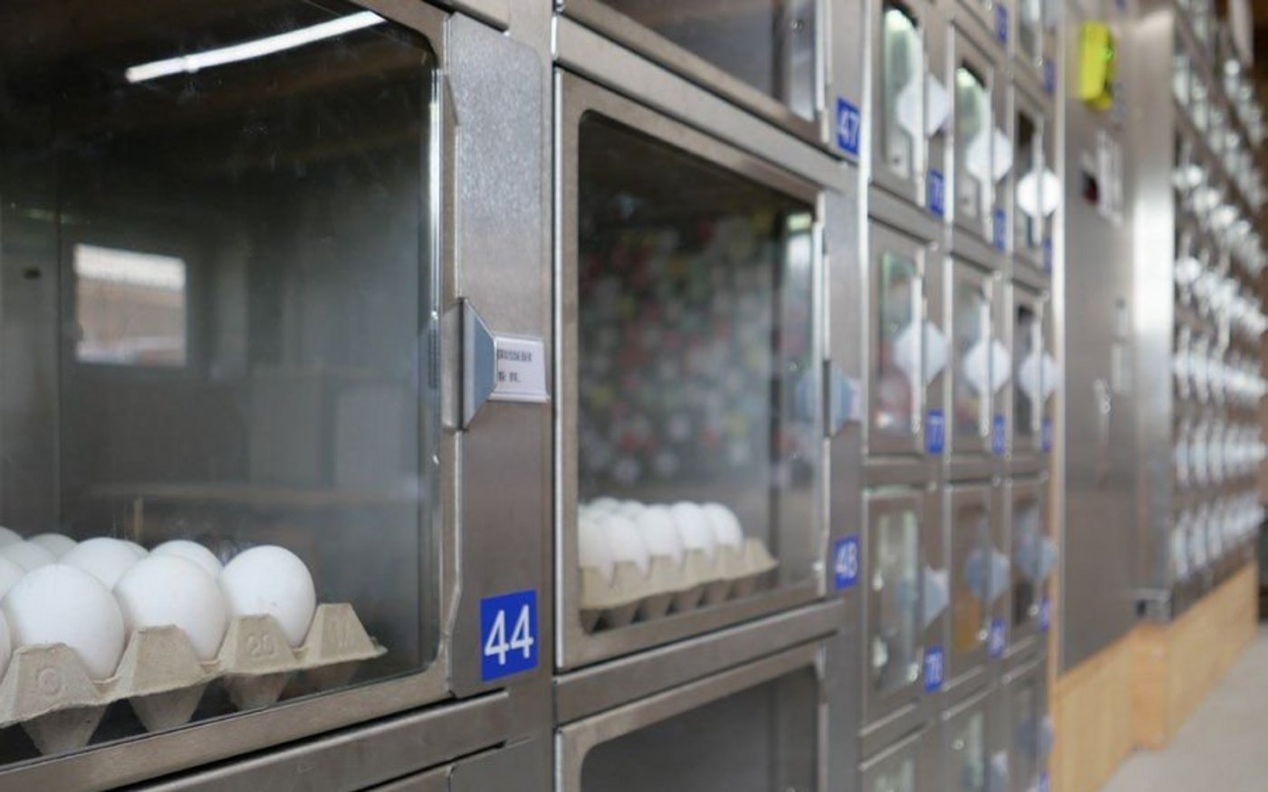 Im ehemaligen Kuhstall hat er nun seinen Verkaufsraum umgebaut. Darin stehen vier grosse VT-Automaten. Aus insgesamt 84 Fächern können Kundinnen und Kunden Produkte auswählen und bequem per Karte oder Twint bezahlen. Dann springt die Tür auf und die Ware ist griffbereit. Die Fächer ermöglichen ein assortiertes Angebot. Birrer befüllt sie gruppenweise mit Eiern verschiedener Grössen- und Güteklassen. Eine Unterteilung besteht auch bei den Verkaufseinheiten. Es gibt Fächer mit Zehnerschachteln, Sechserschachteln oder mit Höckern zu je 30 Stück.