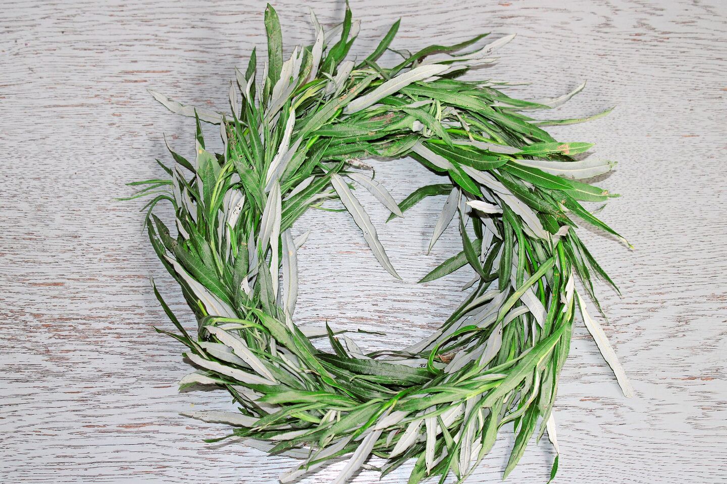 - Weidenruten vorbereiten: Es bewährt sich, die frischen Zweiglein vor dem Flechten mit den Daumen etwas zu kneten, so knicken sie nicht und lassen sich schöner formen. Falls die Zweige bereits getrocknet sind, können sie einige Stunden in Wasser gelegt werden, um sie wieder geschmeidig zu machen. Die Blätter an den Ruten lassen, sie verleihen Volumen und sorgen für ein lebendiges Aussehen.