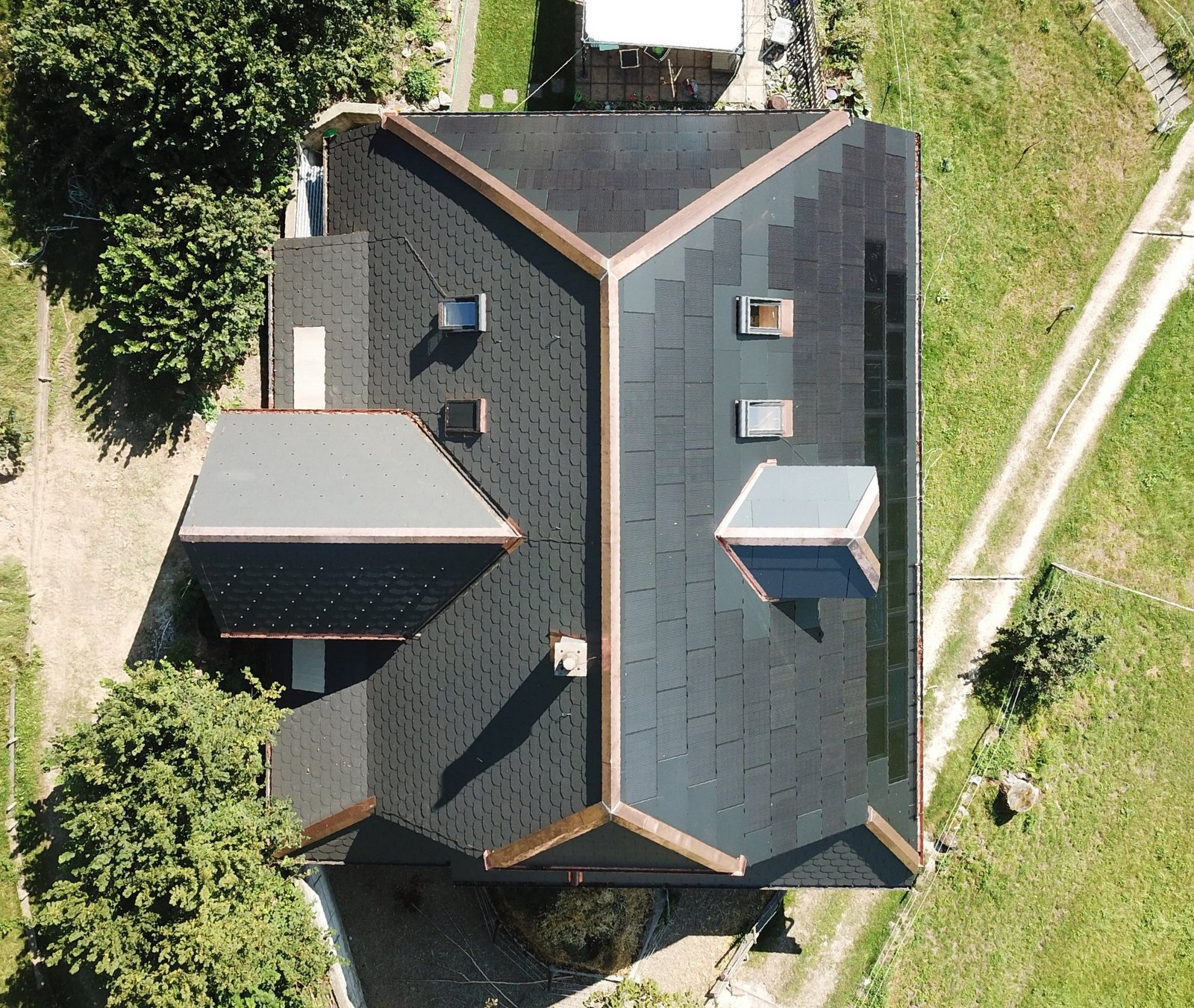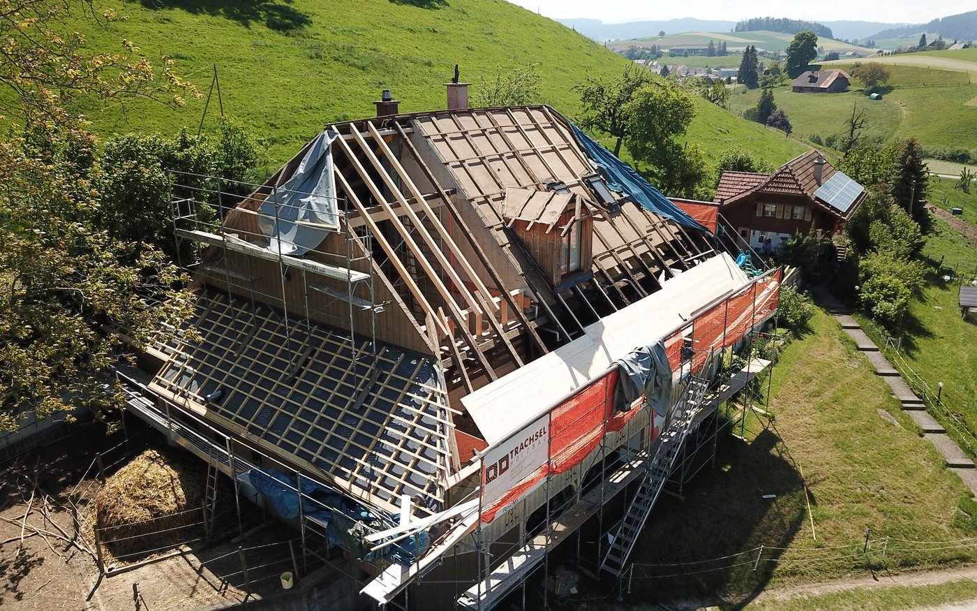 [IMG 4] Vor einigen Jahren wäre das «Nein» der Denkmalpflege schnell und endgültig gewesen. Doch wegen der Energiestrategie 2050 haben sich die Gewichte verschoben. Nicht nur der Denkmalschutz zählt, sondern auch die Energieproduktion. «Das macht es einfacher, auch geschützte Objekte mit moderner Technik auszurüsten», sagt Florian Flükiger von der RenoMa GmbH Bedachungen und Fassadenbau in Worb. Die Firma hat das Projekt geplant und ausgeführt. Ein zweites wichtiges Argument war die Sicherheit. Weil Stählis Haus am Hang liegt, ist es bei Sturmwinden besonders exponiert. Immer wieder flogen bei starken Stürmen Ziegel vom Dach. Das neue Eternitdach ist nun sturmsicher, und die PV-Zellen und Sonnenkollektoren sind bündig eingepasst.