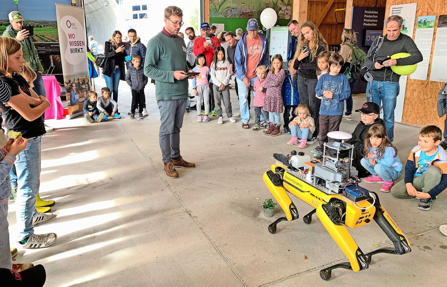 So präsentierte Robin Ehrensperger von der Fachhochschule Ost den hundeähnlichen und per Drohne steuerbaren Roboter von Boston Dynamics, denkbar für die selektive Unkrautbekämpfung.