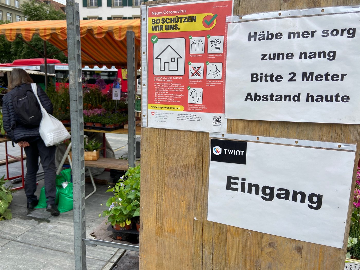 Am Dienstagmorgen konnte in Bern erstmals wieder ein Markt am angestammten Ort stattfinden. Bei kühlen Temperaturen präsentierte sich das Bild aber anders als vor der Corona-Krise. Die Stände sind nur einseitig offen und überall wird mit allerhand Hilfsmitteln die nötige Distanz von mindestens zwei Metern hergestellt.