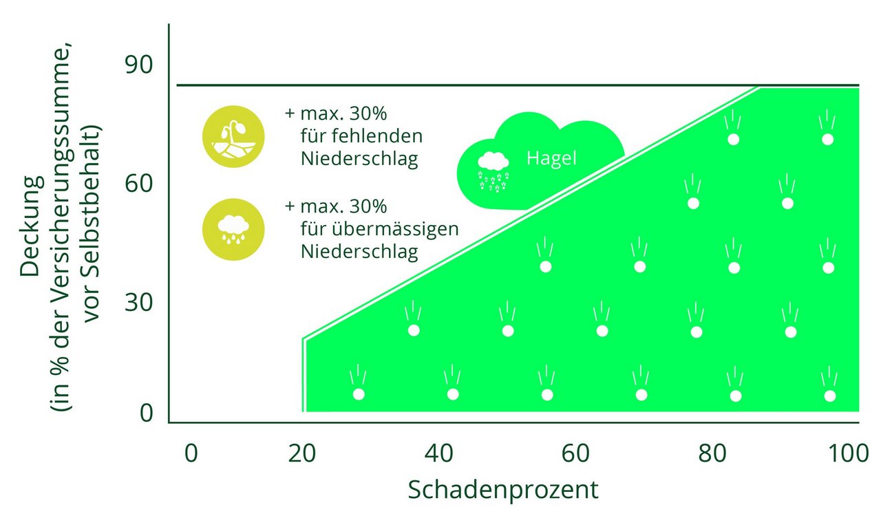 Acker Basis ist eine innovative Mischung aus traditioneller Ernteversicherung mit der Schadenermittlung vor Ort für die Hagelkomponente und einer Wetterindexversicherung für übermässigen oder fehlenden Niederschlag. Die Risiken übermässiger oder fehlender Niederschlag werden auf der Basis vordefinierter Schwellenwerte entschädigt. «Es ist ein Anliegen der Schweizer Hagel, den landwirtschaftlichen Produzentinnen und Produzenten innovative und preiswerte Versicherungsprodukte zur Verfügung zu stellen, um sie im betrieblichen Risikomanagement zu unterstützen», erklärt Hansueli Lusti, Leiter Schweiz bei der Schweizer Hagel Versicherung.