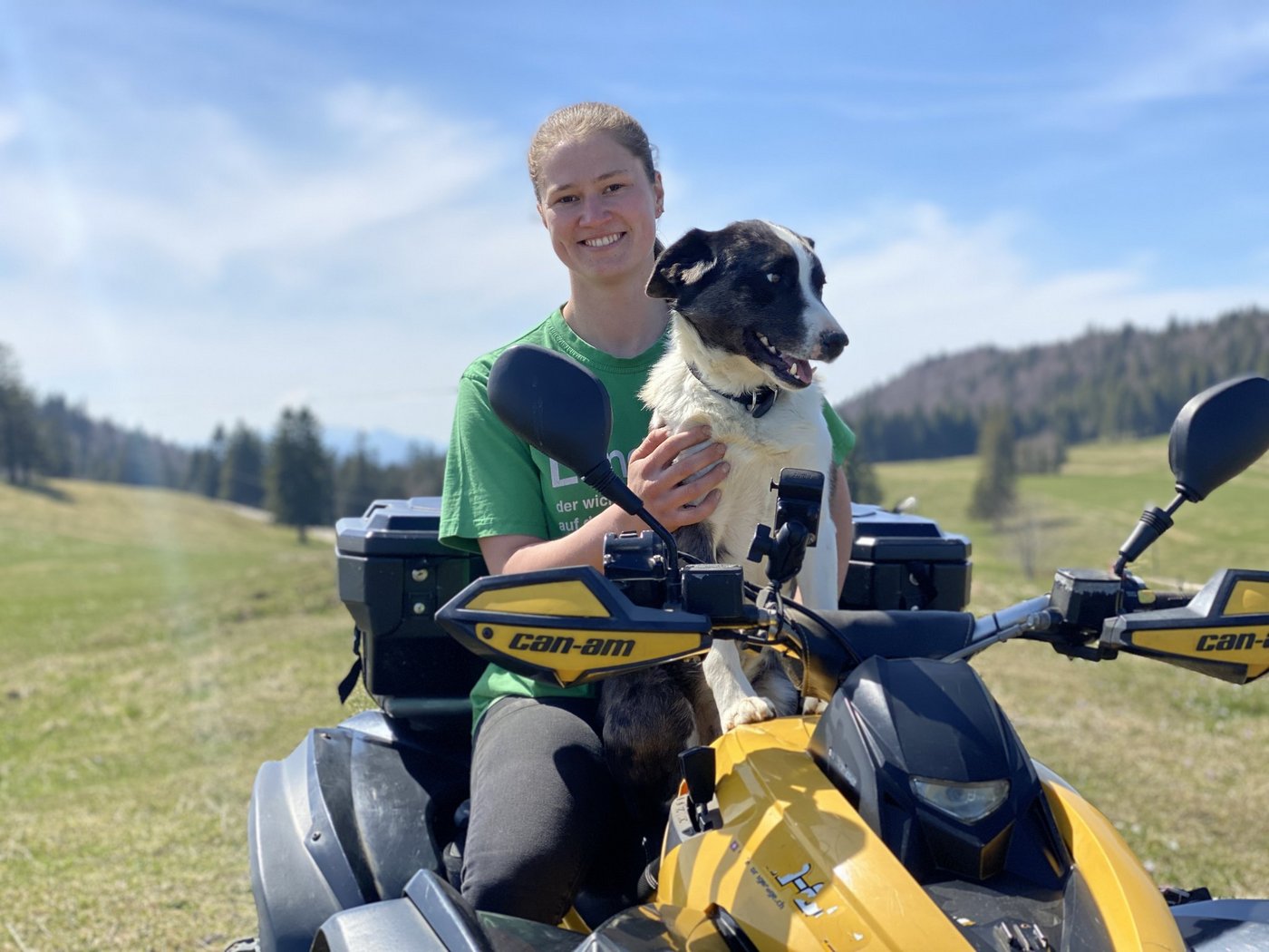 Auf einen kurzen Zuruf hin hüpft Border-Collie-Mischling Mingo vor Fabienne Kaufmann auf den Quad und stützt die Vorderpfoten auf die Haube. Von Steinen und Unebenheiten unberührt brausen die beiden über die Alpweide in Richtung des Betriebs Obergrenchenberg davon. Die 24-Jährige und ihr Hund sind ein eingespieltes Team, das seit drei Jahren hier oben auf 1300 m.ü.M. über dem solothurnischen Grenchen ganzjährig zum Vieh schaut und an fünf Tagen die Woche im betriebseigenen Restaurant Wanderer und andere Besucher begrüsst.