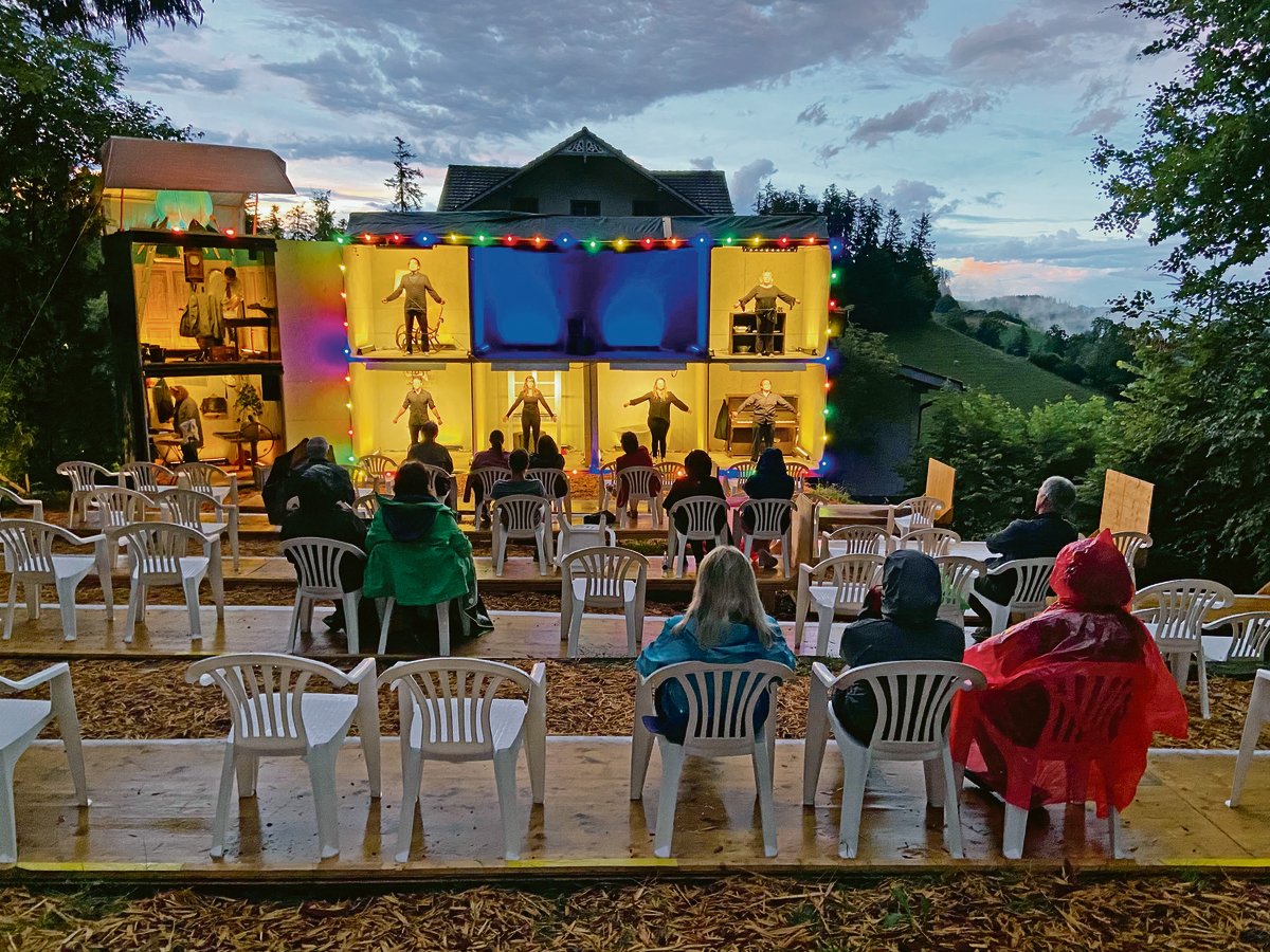 Das Stück mit dem raffinierten zweistöckigen Bühnenbild nimmt auch die Corona-Aktualität auf. Der Erzähler im Eckzimmer oben links, ein Vertreter des BAG, muss sich jedenfalls öfter empören über die mangelhafte Einhaltung der Sicherheitsregeln gegen den Virus. Und das trägt zusätzlich zum Unterhaltungswert bei. Das gilt auch für die Beleuchtung. Auf der Bühne und daneben. Denn wer ab und zu, wie die Himmelsboten leicht beschämt wegschauen muss, der kann sich an der wunderschönen Emmentaler Landschaft als Zweitkulisse laben.