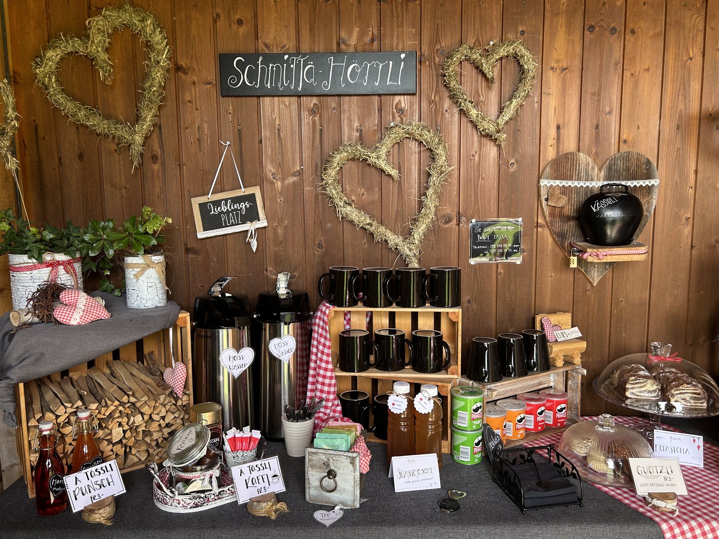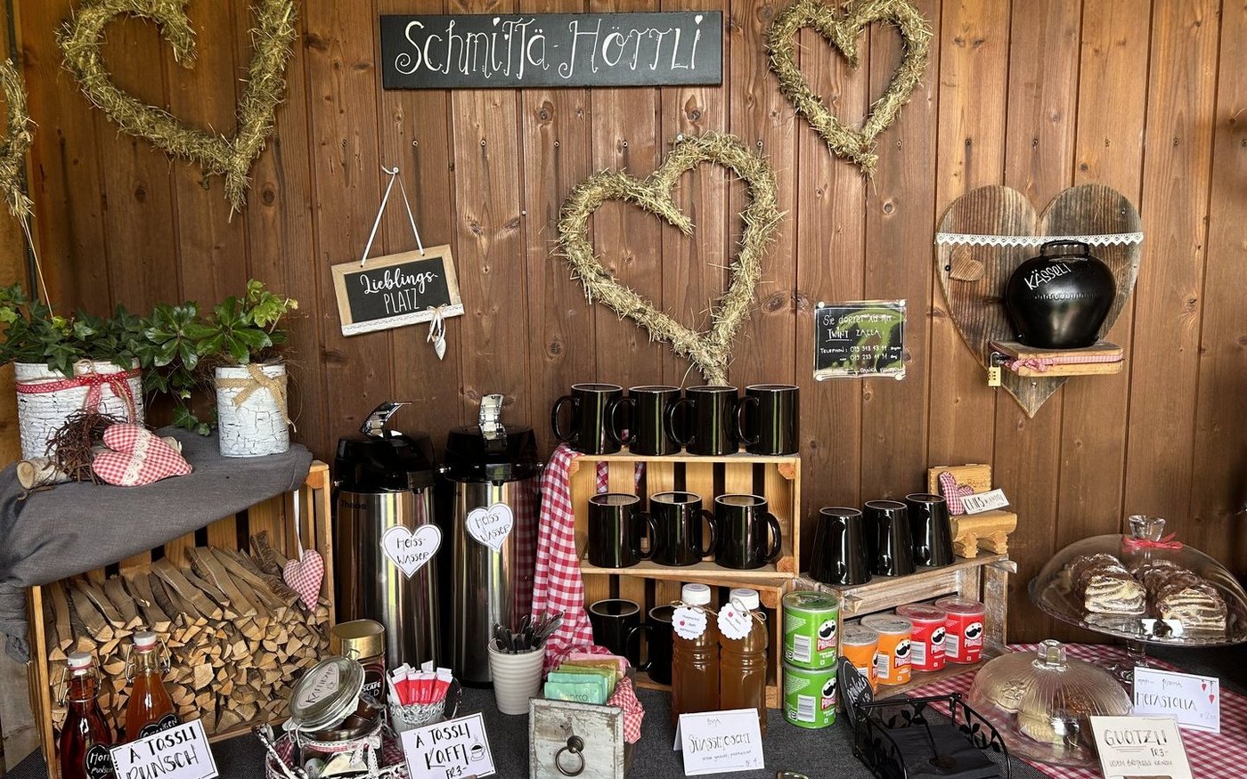 Das Holzhäuschen mit den üppig blühenden Geranien strahlt Behaglichkeit aus. Tafeln in schöner Schrift weisen aufs Angebot hin, Sprüche zaubern den Vorbeigehenden ein Lächeln ins Gesicht. Überall bleibt das Auge an hübschen Gegenständen hängen. Am Morgen bringt Scherrer frisches Gebäck und Wasser für den Kaffee, richtet Kissen auf den Sitzgelegenheiten, stellt Blumen aus dem eigenen Garten vors Hüttli. Bei schönem Wetter oder am Wochenende bringt sie mittags schon Nachschub. «Es läuft wirklich gut», sagt sie. «Jetzt sind es bereits fünf Jahre, seit ich angefangen habe – mit ein bisschen Kaffee, Süssmost und etwas Süssem.»