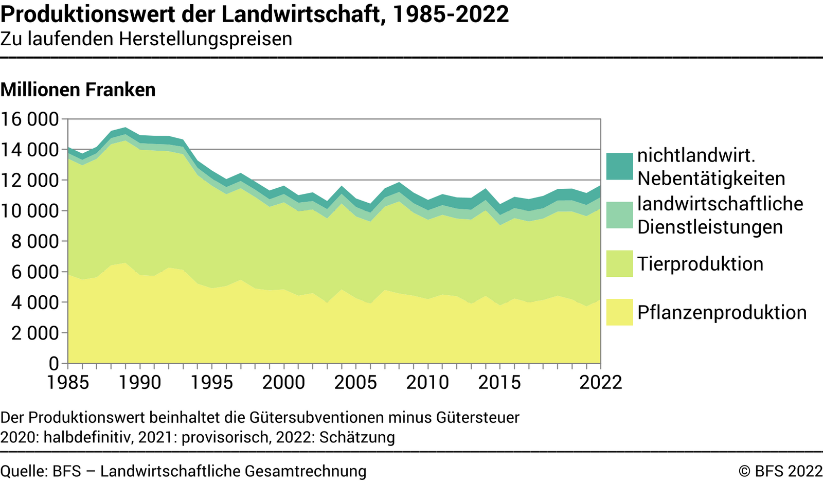 Die Schätzung zeigt insbesondere die Folgen der Teuerung auf: Zwar machten bessere Ernten und höhere Preise bei zahlreichen Agrargütern die höheren Ausgaben für Futtermittel, Energie und Dünger wett, schrieb das BFS. Die markante Zunahme der Preise für Investitionsgüter wie Gebäude oder Maschinen habe jedoch zu höheren Abschreibungen geführt.