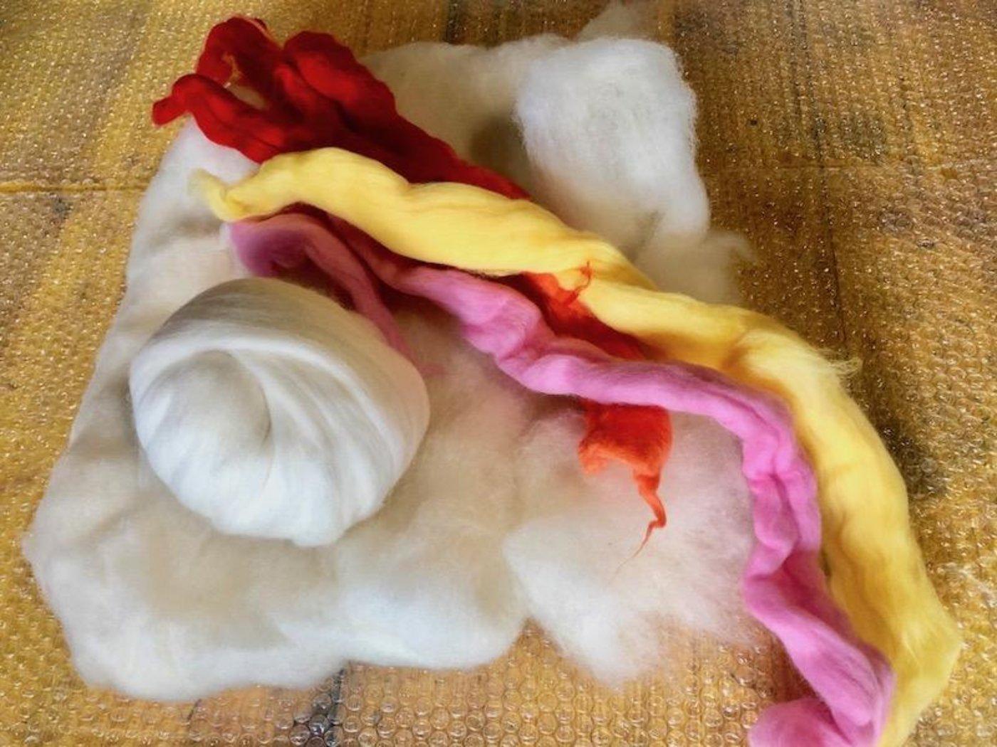 - zusätzliche Wolle, andersfarbig, für ein Muster, beispielsweise Kammzug, Kardwolle, Locken oder Vorfilz