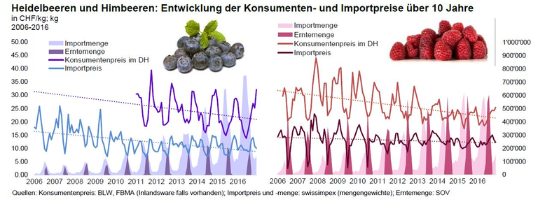 Rückläufig sind seit 2010 die Preise für die beiden Beeren-Sorten. Bei den Heidelbeeren sank der durchschnittliche Kilopreis von 26,90.- auf 21,50.-. Bei den Himbeeren von 25,90.- auf 21,60.-.