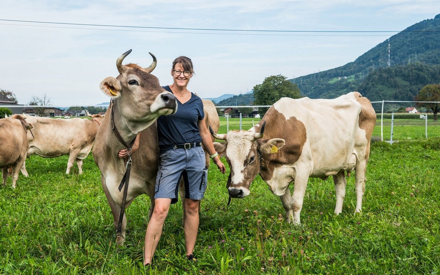 Es ist ruhig hier auf der Rinderweide. Nur das Bimmeln der Glocken und das Knirschen der Schuhe im Gras sind zu hören. «Ich geniesse diese Ruhe», sagt Karin Landolt bei ihrem Kontrollrundgang, während sie prüft, ob der Zaun stabil steht, genug Wasser im Trog ist und keines der Tiere gekalbt hat. «Die Tiere geben einem so viel. Du bisch ä Liebi, gäll …», sagt sie und krault eines der Braunviehrinder am Hals.