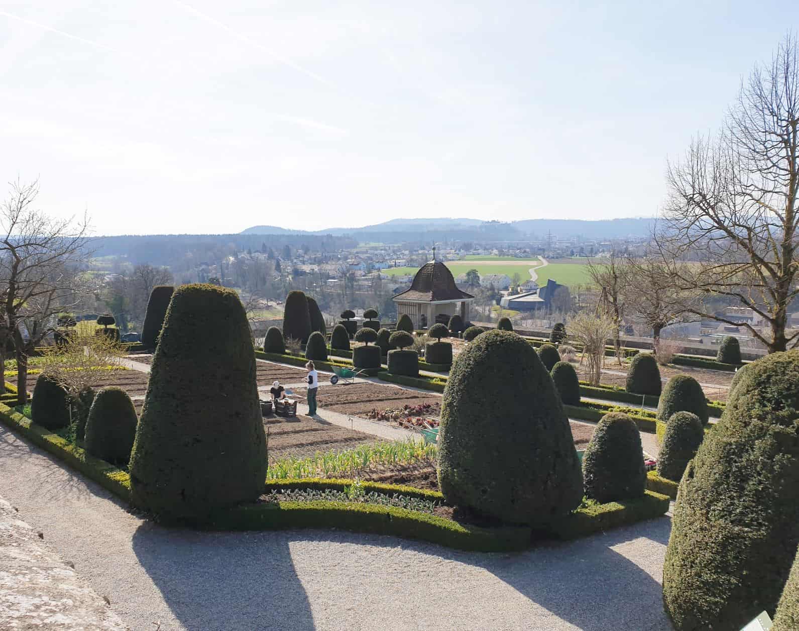 Im Schlosshof oben sorgt ein frischer Wind für kalte Ohren, beim Abstieg auf der Treppe zwischen mächtigen Eibensäulen wird es wärmer, im Neugarten unten tragen die Gärtnerinnen kurze Ärmel. Sie haben Schwarzwurzeln und Schabzigerklee ausgesät, setzen Wurzelgemüse zurück ins Beet, das sie im Herbst zum Überwintern ausgegraben haben, jäten Unkraut und bringen Kieswege in Ordnung. Gemüse wird vermehrt Im Garten vom…