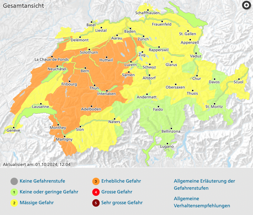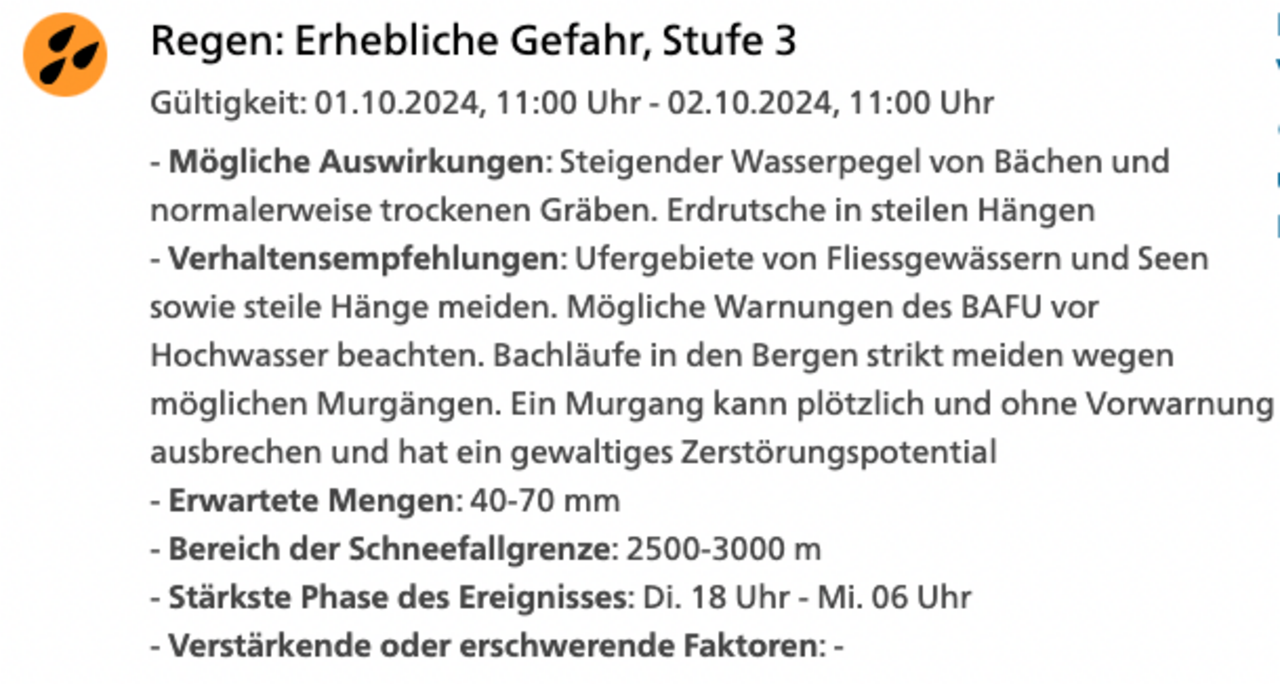 Vor allem in der Westschweiz, im Jura und in den Kantonen Freiburg, Bern und Aargau sowie in Teilen der Waadt und des Wallis könnten Bäche und normalerweise trockene Gräben sich mit Wasser füllen und dies zu Erdrutschen führen, warnt Meteoschweiz und verweist auf Hochwasserwarnungen des Bundesamtes für Umwelt (Bafu). Grund für die Warnung ist das Sturmtief «Isaac».