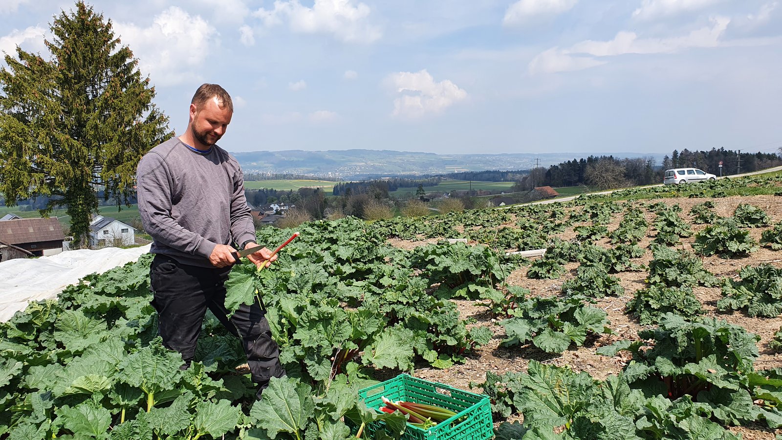 Rhabarber ist eine Dauerkultur. Wie Obstbäume oder Spargeln bleibt und wächst Rhabarber jahrelang auf derselben Fläche. «Der Rhabarberanbau ergänzt sich gut mit meinen anderen Betriebszweigen. Nebst den Pflegearbeiten im Frühling in den Kulturen und dem Anbringen der Hagelnetze, passt die Ernte des Rhabarbers am Morgen ideal in unseren Tagesablauf und die Mitarbeiter sind so ausgelastet», zeigt sich Stefan Füglister zufrieden. Die Ernte beginnt Mitte April und dauert bis zum längsten Tag des Jahres (dieser ist dieses Jahr am 21. Juni). Dabei ist Handarbeit gefragt: Der Stängel wird rausgezogen und das Blatt wird mit einem scharfen Messer kurzgeschnitten. Fünf bis sechs Mitarbeiter ernten so je um die 30-40 kg Rhabarberstangen pro Stunde. In Kisten gepackt gelangt die Ernte dann nach Stettfurt zur Firma Gamper, wo sie gewaschen und verkaufsfertig verpackt wird. Danach gelangen Sie u.a. in die Migros- und Volg Filialen in den Verkauf. Rund 20 Tonnen ernten sie mit ihren Mitarbeitern jährlich.