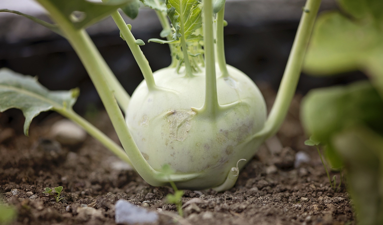 Der Kohlrabi ist ein ungeduldiger Geselle. Nie sitzt er unter der Erde und im Frühling ist er einer der ersten, die geerntet werden können. Die Kugel, die über der Erde anschwillt, ist genau genommen die runde Verdickung eines Stängels. Im Gegensatz zu seinen Kohlverwandten bildet er sie aber nicht unter der Erde, sondern über der Erdoberfläche aus. Er weist entweder eine blauviolette oder eine grünweissliche Farbe auf.