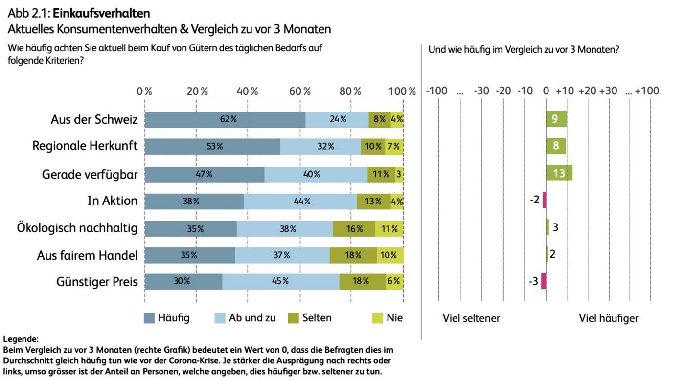 Zwar scheint den Schweizerinnen und Schweizern die inländische Herkunft und Regionalität generell wichtig zu sein, immerhin achten gemäss der Studie des IKM deutlich mehr als die Hälfte der Befragten darauf. Im vergleich zum Verhalten vor drei Monaten, also vor der Corona-Krise, wurden aber Herkunft, Regionalität und Verfügbarkeit beim Einkaufen wichtiger. Ebenso achtete man etwas mehr auf Nachhaltigkeit und Fairen Handel.