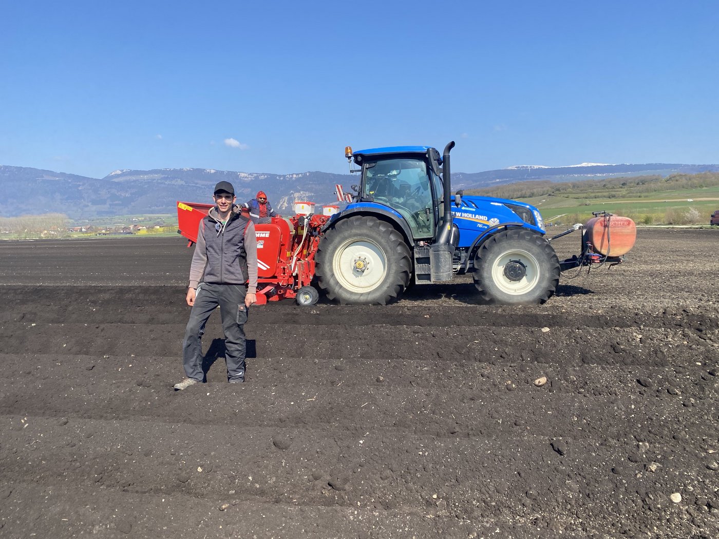 «Ich absolviere mein drittes Lehrjahr auf einem intensiven Ackerbaubetrieb, der 145 Hektaren umfasst – hier läuft es immer Vollgas», meint er und findet offenbar Gefallen daran. Dementsprechend finden wir seinen Lieblingsort nicht etwa neben einer schönen Kuh oder auf einem Hügel mit Sonnenuntergang, sondern auf dem 2 Meter hohen New Holland. «In meiner Freizeit ging ich meinem Bruder schon früher auf einem Lohnunternehmen aushelfen». Er zeigt in die Ferne des Kartoffelackers. «Diese Aussicht erklärt doch alles», sagt der begeisterte Junglandwirt. «Aber manchmal ist es schon weit – von Dändlikon nach Mathod», fügt er hinzu und lässt den Blick über den schwarzerdigen Acker schweifen.