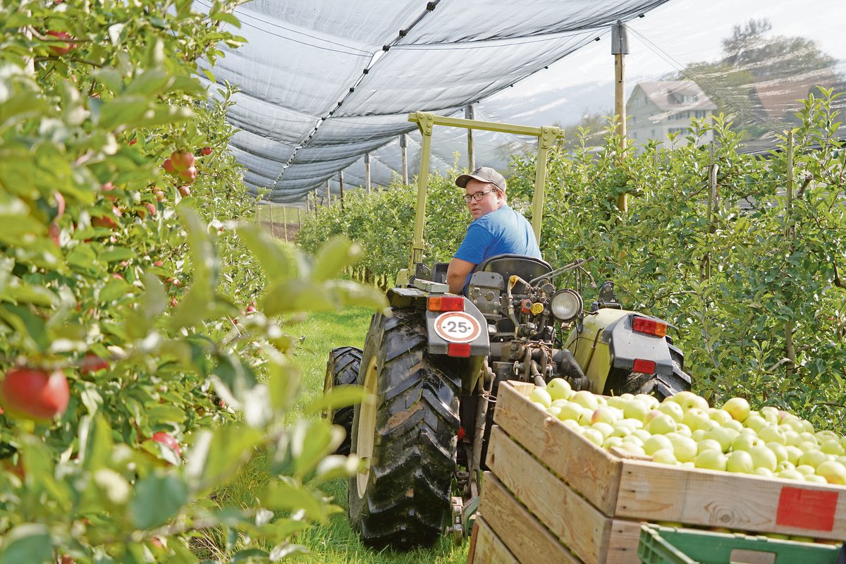 Ganz konkret pflücken wir jetzt die Spätsorten Braeburn und Fuji. Verkauft werden alle Früchte ausschliesslich im Hofladen oder wir liefern sie direkt an die umliegenden Detaillisten. Es ist ein gutes Apfeljahr Bevor wir morgens in die Anlage fahren, sortieren wir die bereits gepflückten Früchte, denn der Hofladen muss wieder frisch aufgefüllt werden. Pro Tag pflücken fünf Erntehelfer und ich rund 6000 Kilo Äpfel.…