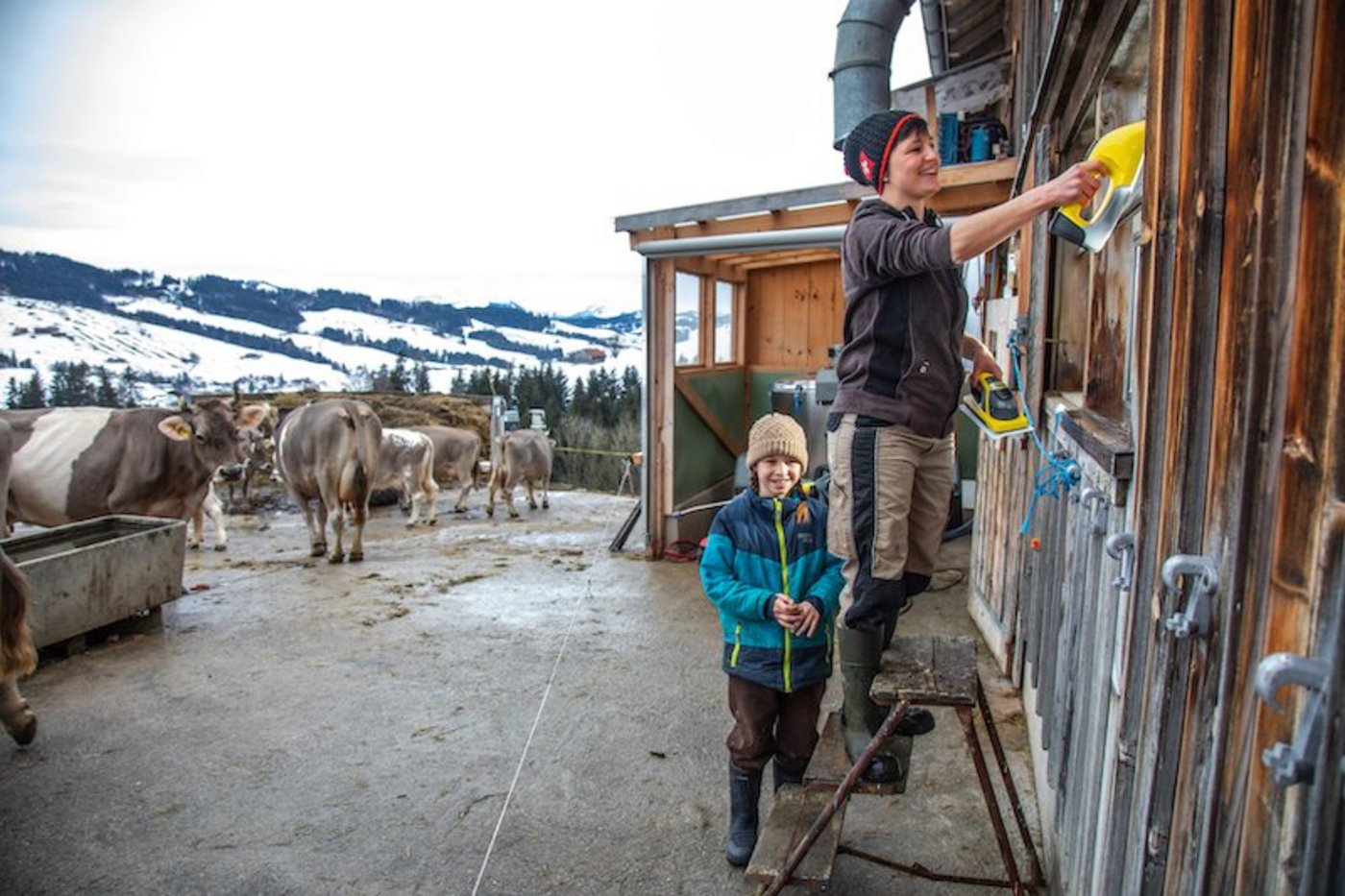 Eine warme Mütze mit Schweizerkreuz auf dem Kopf, in Gummistiefeln und Schürze spritzt Marianne Dietrich mit dem Kärcher den Traktor sauber. Wenn man sie so beobachtet, kann man fast nicht glauben, dass sie in drei Stunden mit ihren drei Kindern Hansueli, Christian und Franziska in die Skiferien fahren will. Gepackt ist bereits fertig, aber auf ihrer To-do-Liste stehen noch Milchkammer reinigen, Zopf backen und…