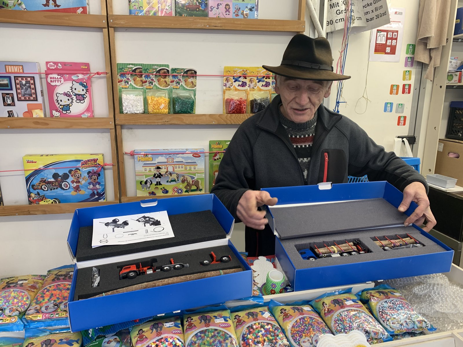 Vier Kinder schauen mit verdutztem Blick zum Spielzeugstand, der mitten im Dorf an der Strasse vor dem Gemeindehaus steht. «Isch Chilbi?», fragt sich da mancher, der mit dem Auto vorbeifährt. Othmar Rüttimann kommt aus Arbon TG, ist 64 Jahre alt und seit 24 Jahren Marktfahrer. Er steht mit seinem «Wundertrüggli», wie er seinen Verkaufsstand nennt, seit Ende November an den Wochenenden an der Dorfstrasse in Bütschwil…